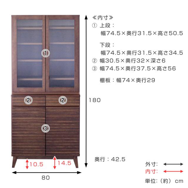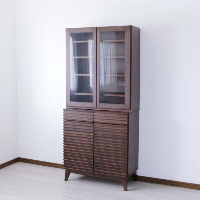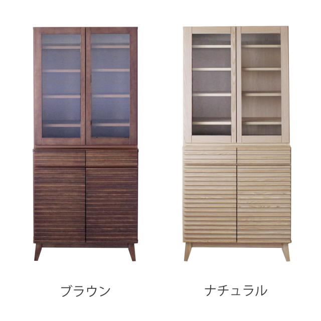 食器棚 幅80cm 高さ180cm ルーバーデザイン 天然木 ( カップボード キッチン 収納 フルスライドレール 食器収納 引き出し ブラウン ナチュラル 可動棚 )