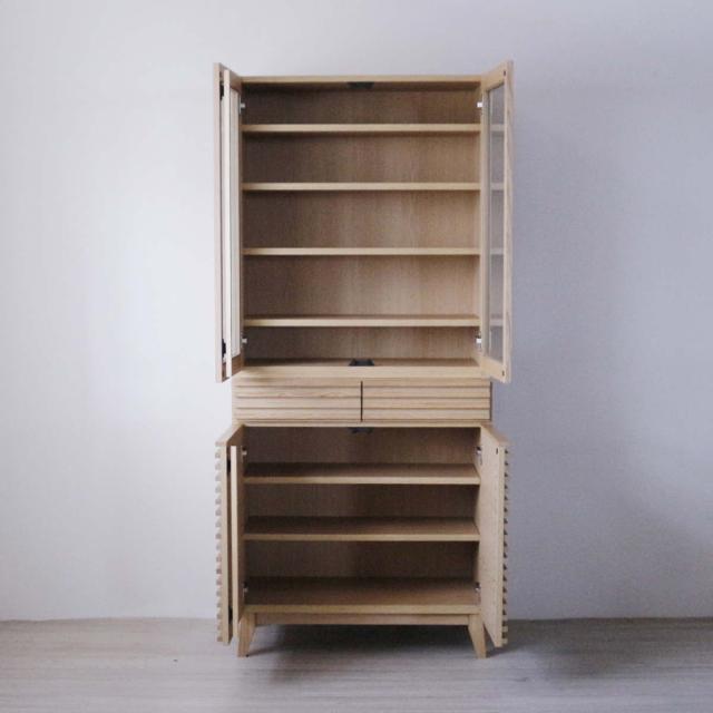 環境に配慮したFSC認証を取得した天然木工芸突板を使用した食器棚です。ルーバー部分に天然木無垢を使用し、モダンで高級感のあるデザイン。背面は化粧仕上げが施され、細部まで手を抜かず、丹精込めて製造されています。