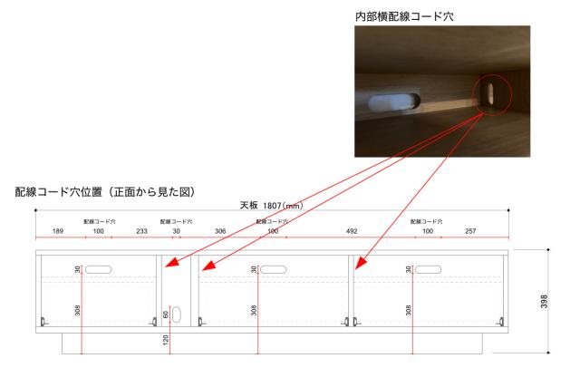 天板にはコードを通すスリット、背面には配線コード穴、引出しと引出しの間の仕切壁には、横配線コード穴があります。テレビやAV機器の配線が簡単にでき、スッキリと見せることができます。