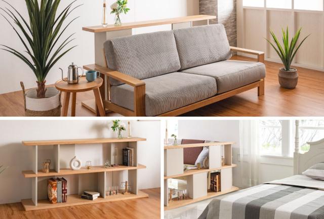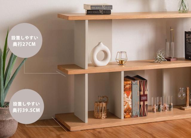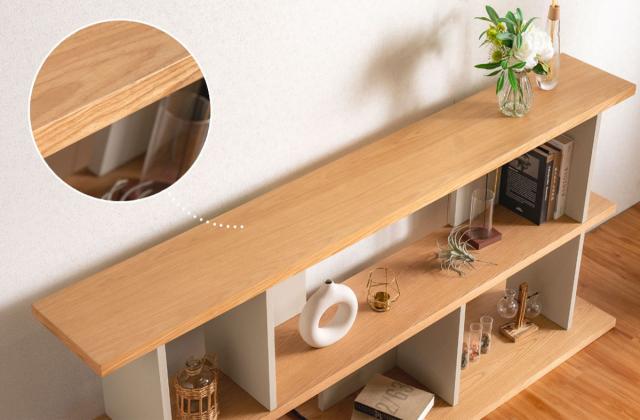 環境に配慮したFSC認証を取得した天然木工芸突板を使用したオープンシェルフです。ナチュラルなフレームとグレージュのツートンカラーが、空間に明るさと優しさをプラスします。ソファの後ろや壁付け、お部屋の間仕切りとして、3wayでお使いいただけます。