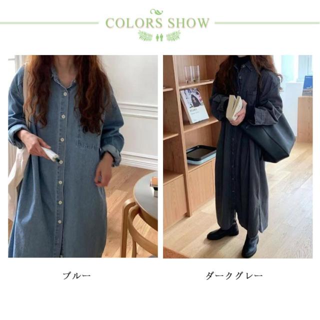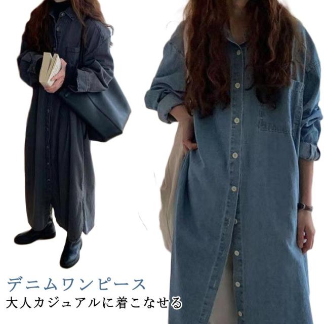 デニム ワンピース 長袖 レディース 春秋 ゆったり シャツワンピース 薄手 無地 前開き フロントボタン ポケット ドロップショルダー 袖口 バック センターボックス プリーツ ラウンドヘム 襟 短め ナローショートカラー 韓国 送料無料