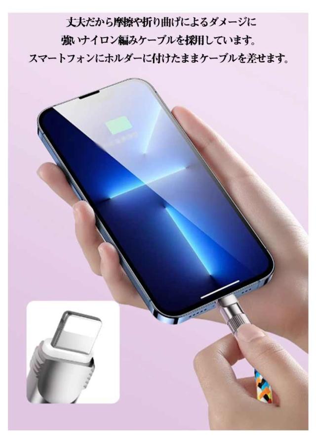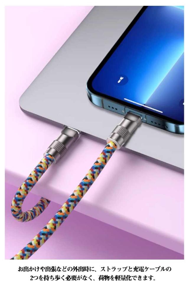 | スマホストラップと充電ケーブルがひとつに! 長さ1.2m/0.3m 腕掛け/斜め掛け type-C/Lightning スマートフォン用ストラップとしても、充電ケーブルとしても使える便利な2in1仕様の充電ケーブルストラップです。 最大60Wの電力供給に対応しており、高出力の急速充電もスムーズに行えます。 ストラップとして使用すると、スマートフォンを手首や腕に掛けたり、斜め掛けにしたり、バッグやポケットから取り出さなくてもすぐに操作できます。 充電ケーブルとして使用する際は、などに接続することでどこでも充電が可能です。 丈夫だから摩擦や折り曲げによるダメージに強いナイロン編みケーブルを採用しています。 スマートフォンにホルダーに付けたままケーブルを差せます。 お出かけや出張などの外出時に、ストラップと充電ケーブルの2つを持ち歩く必要がなく、荷物を軽量化できます。 | |