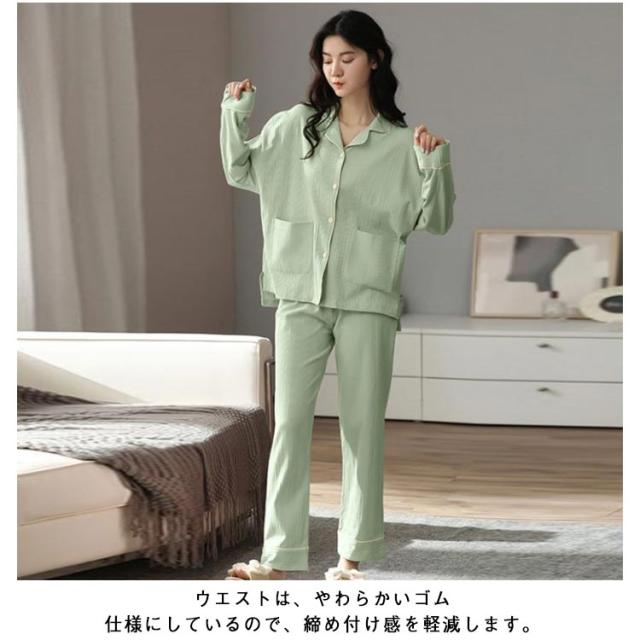 | シンプルなパイピングデザインの前開きタイプルームウェアの登場です。【100%綿】 通気性や吸水性に優れた、綿100%素材を使用。汗をかいても蒸れにくく、お肌にもやさしい。 春や秋冬など、気候の良い時期の着用をおすすめいたします。 ポケットはちょっとした小物入れに便利です。 ウエストは、やわらかいゴム仕様にしているので、締め付け感を軽減します。 こだわり設計でゆったり着られる快適パジャマ♪ 幅広い年齢層におすすめできる、贈り物にも喜ばれるナイトウェアです。 | |
