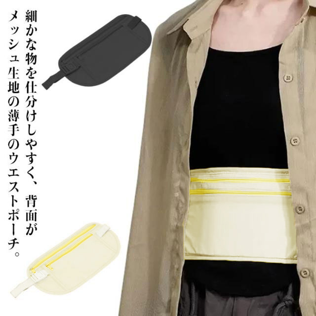 | カラー:ブラック ベージュ 細かな物を仕分けしやすく、背面がメッシュ生地の薄手のウエストポーチ。 薄型設計のため服の中にも隠しやすく、外からも着用が分からない防犯スマートデザイン。 ファスナーポケットが2段あり、1段目のポケットの内部には小分けポケットが付いています。 海外旅行に便利なパスポート・チケット・クレジットカード・現地通貨などを肌身離さず安全に保管するための貴重品入れです。 ベルトの長さが調節可能なので、性別を問わず体にピッタリのサイズでお使いいただけます。 | |