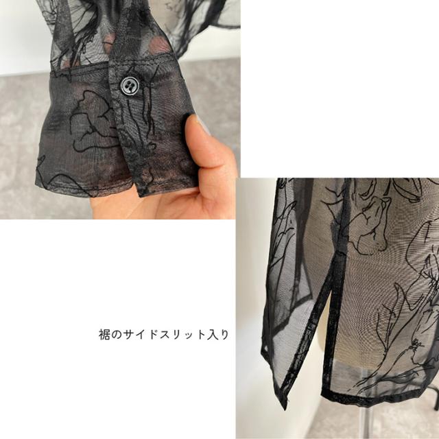 新作 サイドスリット花柄フロッキープリントオーバーサイズシアーシャツ レディース ロング 長袖 夏 秋 ブラウス 前開き トップス アウター 羽織り 大きいサイズ おしゃれ レイヤード 重ね着 ゆったり 涼しい