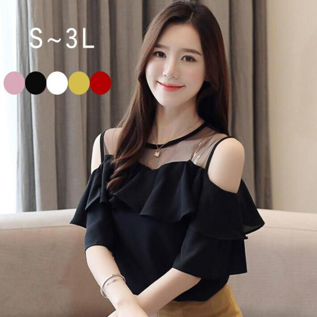 フリルシフォンブラウス 肩出し オープンショルダーブラウス ブラウス シースルー 切り替え フリル 透け セクシー きれいめ ゆったり 半袖 S M L 2L 3L