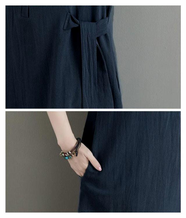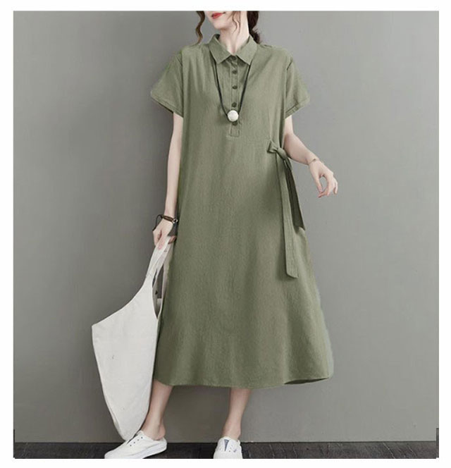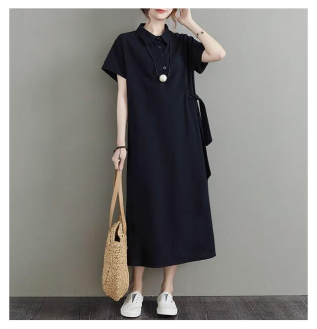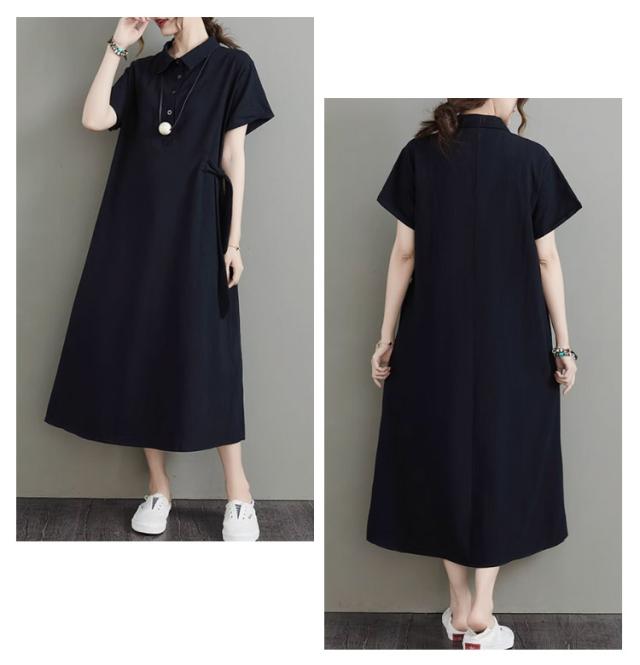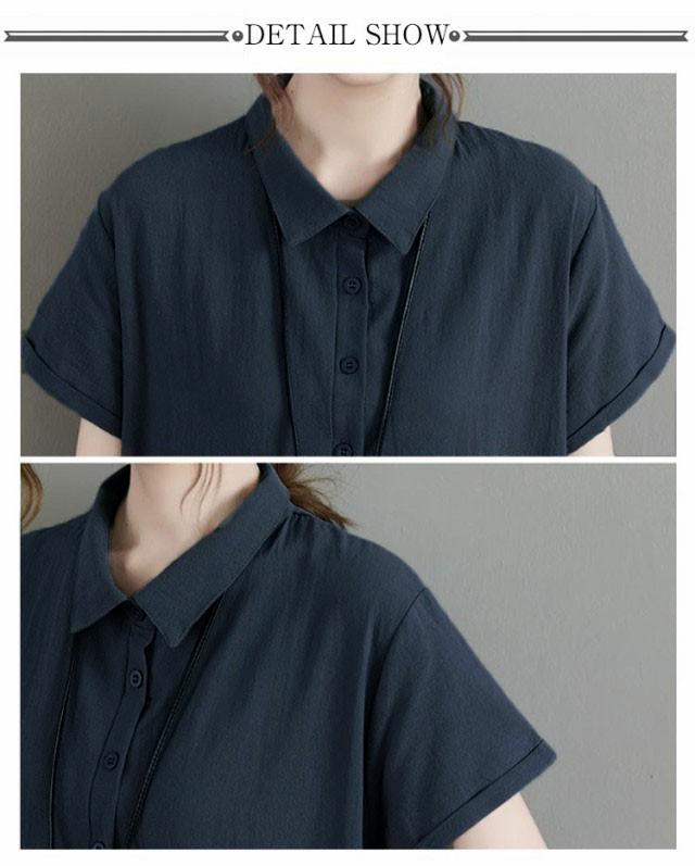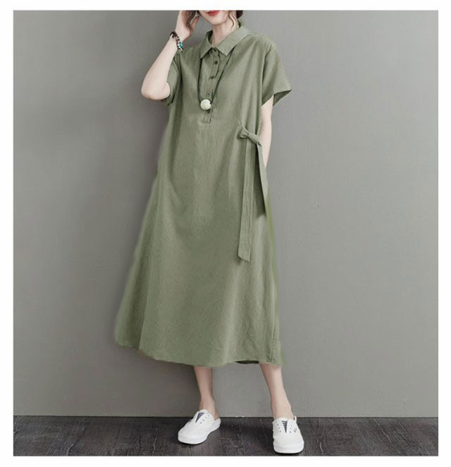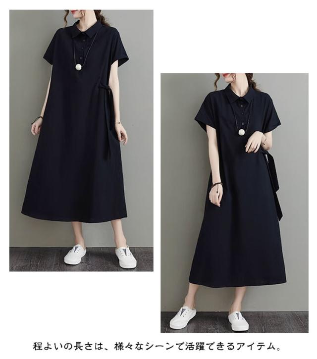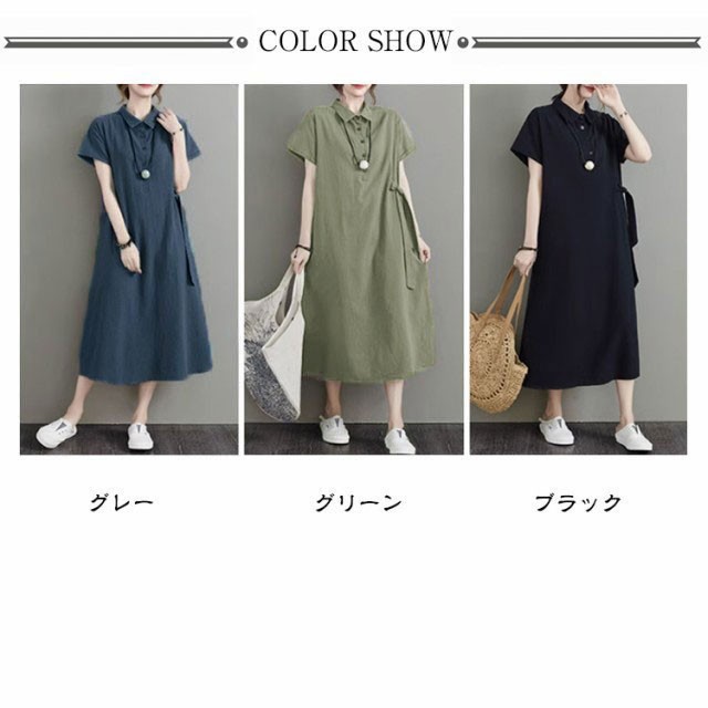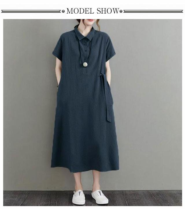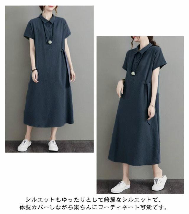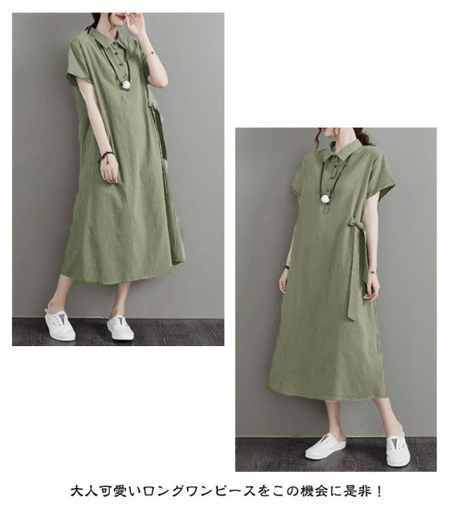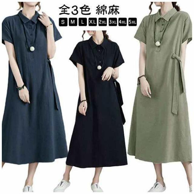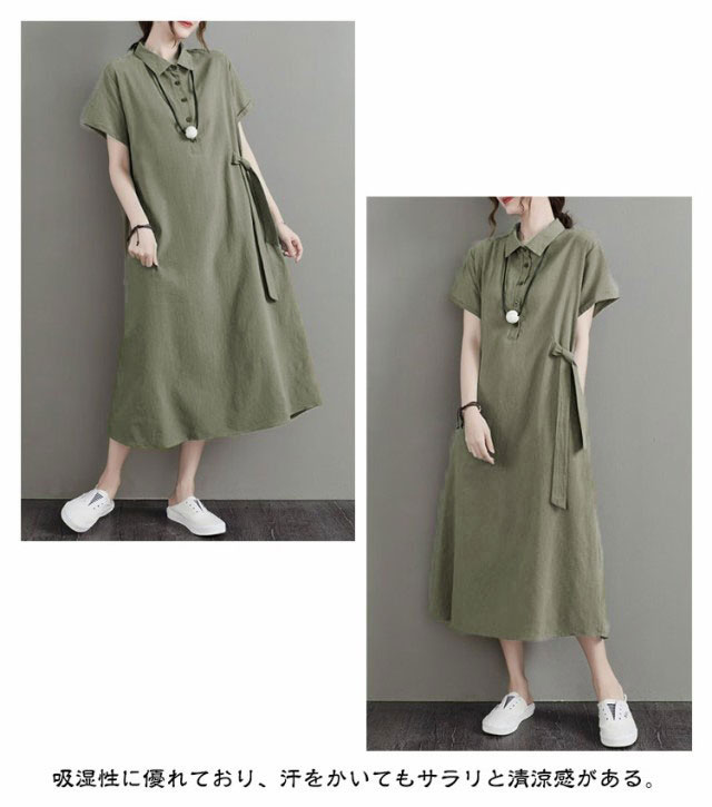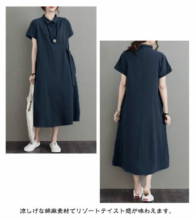 カジュアル 半袖 二の腕カバー ロングワンピース きれいめ 夏 ワンピース 涼しい 綿麻 レディース 大きいサイズ ロング 襟付き Aライン ナチュラル ポケット付き ポロシャツワンピース 無地 シンプル シャツワンピース