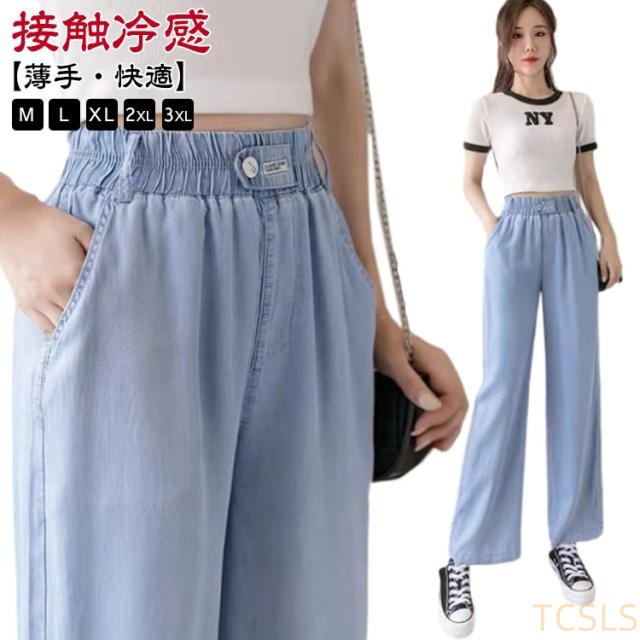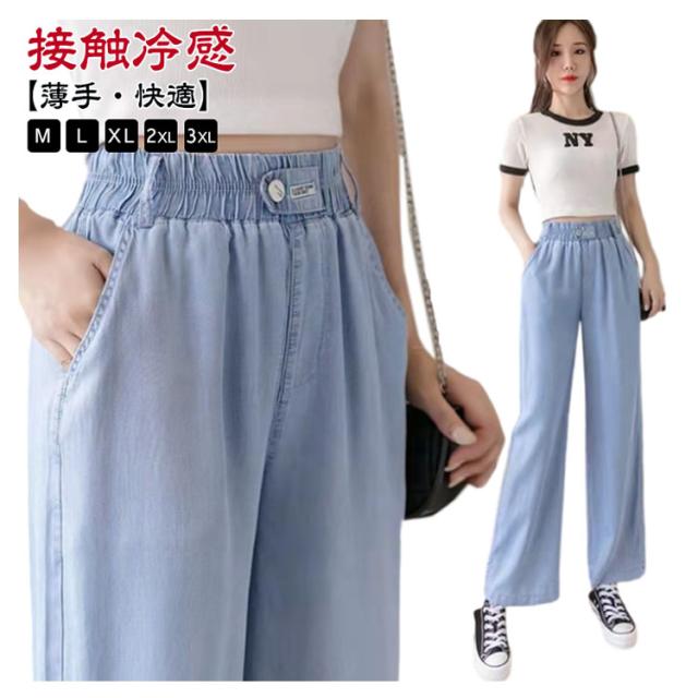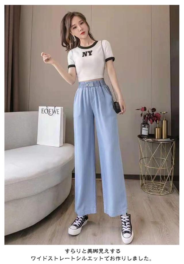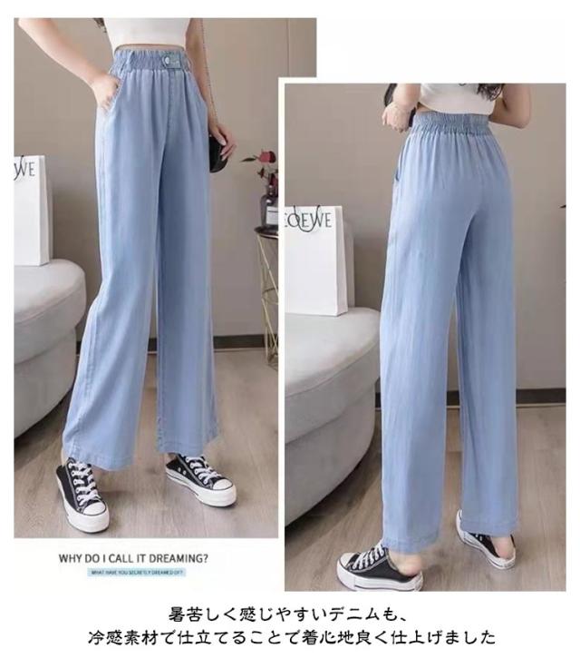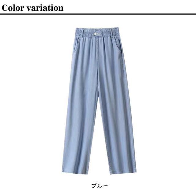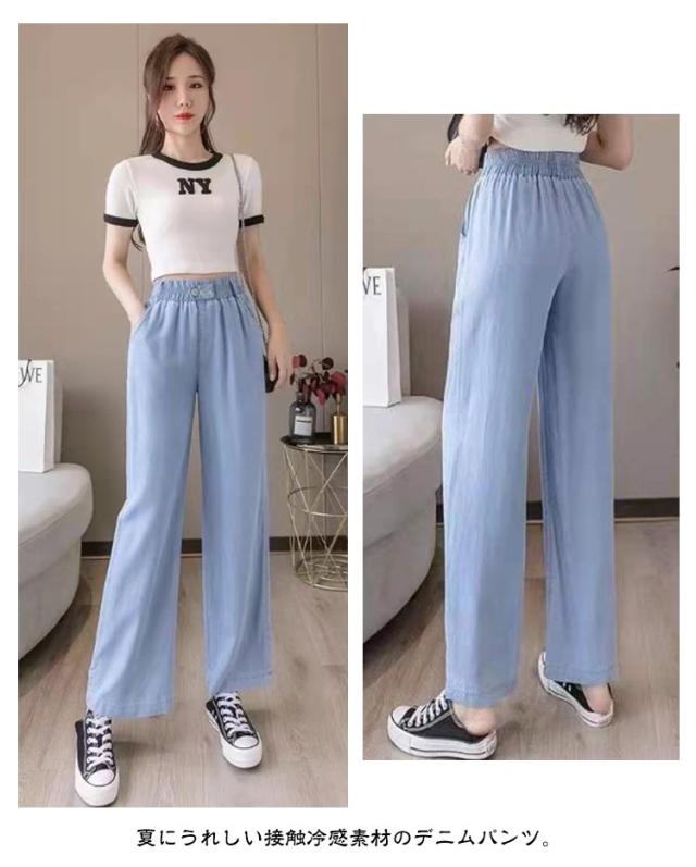 UVカット ひんやり デニムパンツ ワイドパンツ レディース 接触冷感 デニム 薄手 夏 体型カバー 大きいサイズ 涼しい ロング丈 ストレートパンツ ジーンズ 無地 ボトムス ストレート ズボン ゆったり 着痩せ 美脚 ウエストゴム