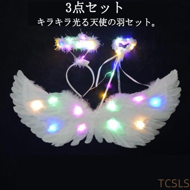 キラキラ光る天使の羽 3点セット ハロウィン コスプレ用 パーティー 羽根 フェザー 天使の羽 キラキラ光る天使の羽 ウィング イベント ハロウィン 妖精 コスプレ 大人 コスチューム 仮装 変装 変身 LEDライト付き 演出 子供 男女兼用 ホワイト カラフル