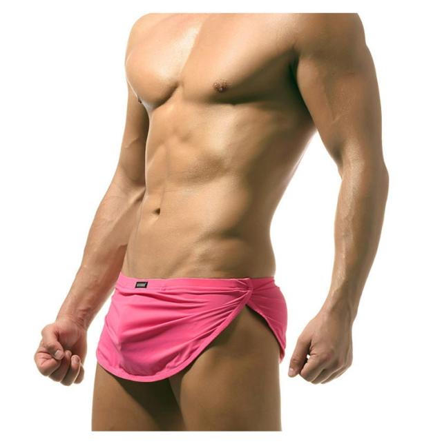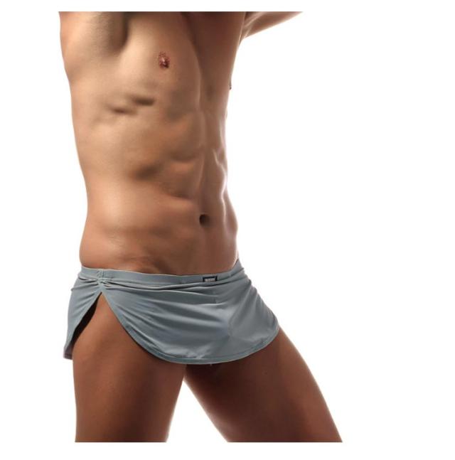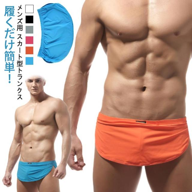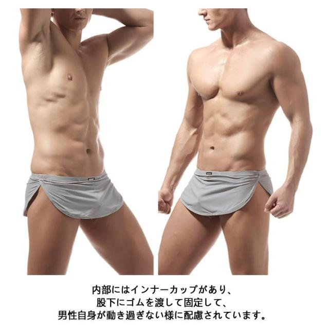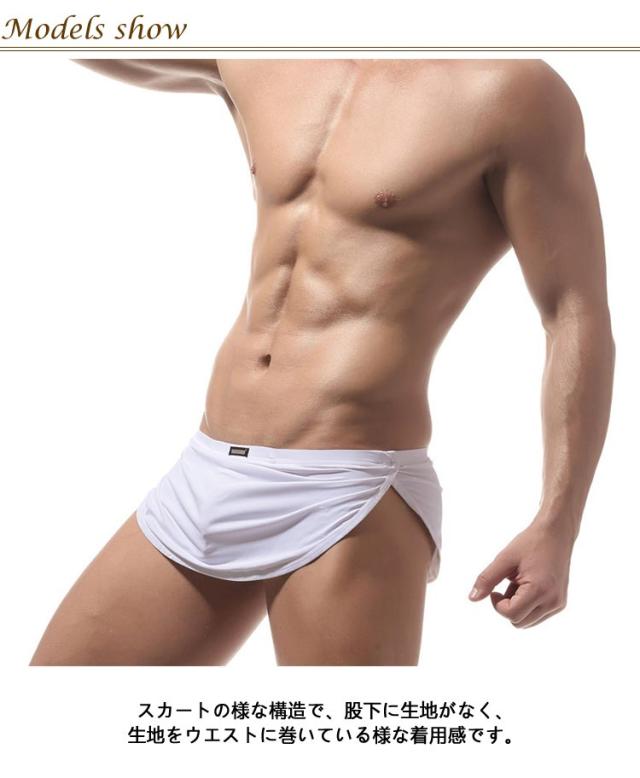 | 履くだけ簡単! メンズ用 スカート型トランクス スカートの様な構造で、股下に生地がなく、生地をウエストに巻いている様な着用感です。 内部にはインナーカップがあり、股下にゴムを渡して固定して、男性自身が動き過ぎない様に配慮されています。 フロント左右にとても深いスリットのあるデザインで、足がよく見えて健康的なセクシー感を演出いたします。 | |