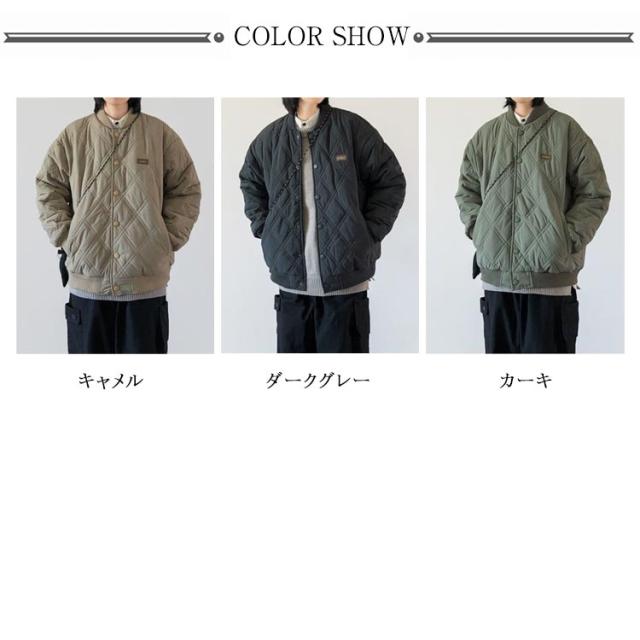 | S-3XL!春、秋、冬に着用できるノーカラーブルゾン。 ユニセックスなデザインなので男性でも女性でも着用可能です。 カッコいい上にしっかりとした防寒性があり暖かいのが人気の秘訣。 ひょうたん型のキルティングによって中綿が偏りにくく、全体をバランスよく暖めてくれます。 首元は、人気の高いノーカラータイプでスッキリとした 印象をキープ。 アウターとしてはもちろん、室内で肌寒い時に羽織ったり、車移動やワンマイルウエアとしても大活躍! 真冬にはロングコートのインナーとしても活躍してくれる優れモノです。 | |