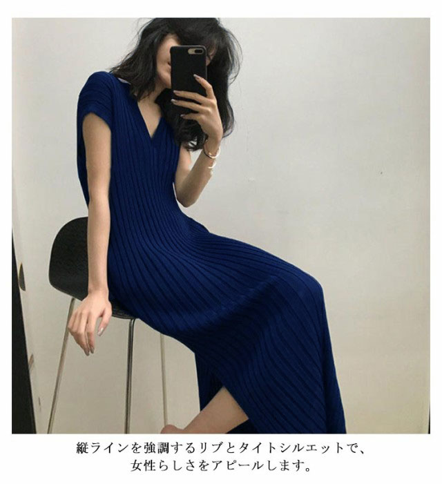 送料無料 リブニット ワンピース Vネック タイトワンピース レディース サマーニット リブニット 半袖 フレンチスリーブ Iライン スリム シンプル ロング丈 サイドスリット タイト 大人 可愛い セクシー おしゃれ カジュアル オフィス