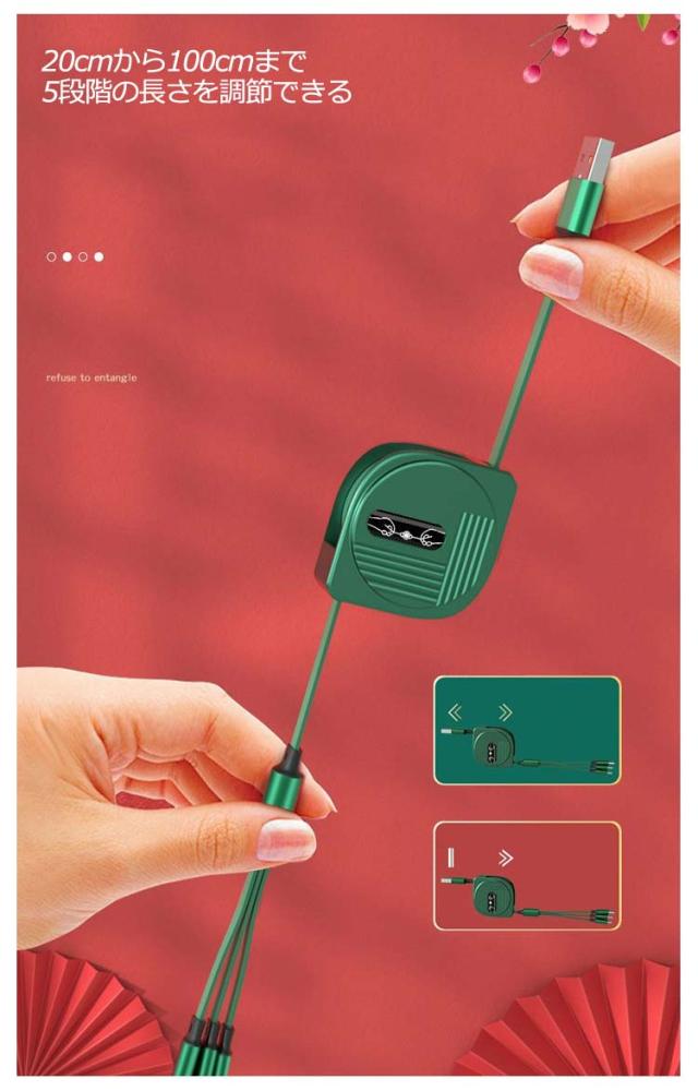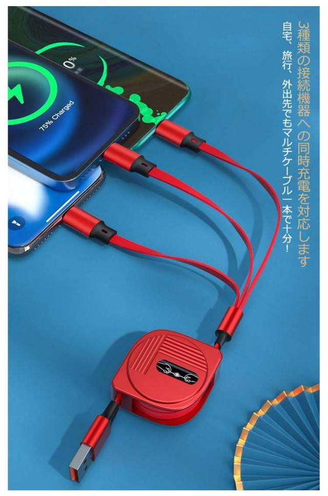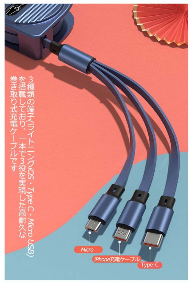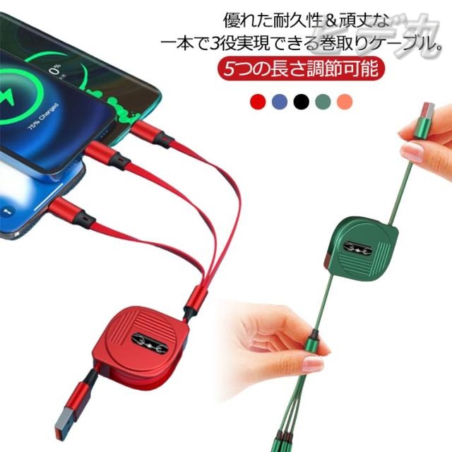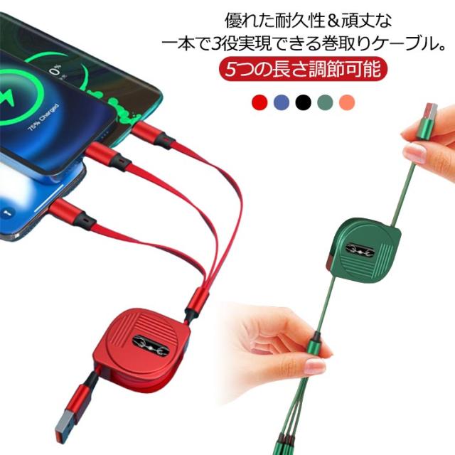 送料無料 急速充電 3in1 ケーブル 巻取り 巻き取り充電ケーブル 1本3役 ライトニングケーブル Type-Cケーブル Micro USBケーブル iPhone充電ケーブル 5つの長さ調節可能 断線防止 同時充電 コンパクト 便利グッズ