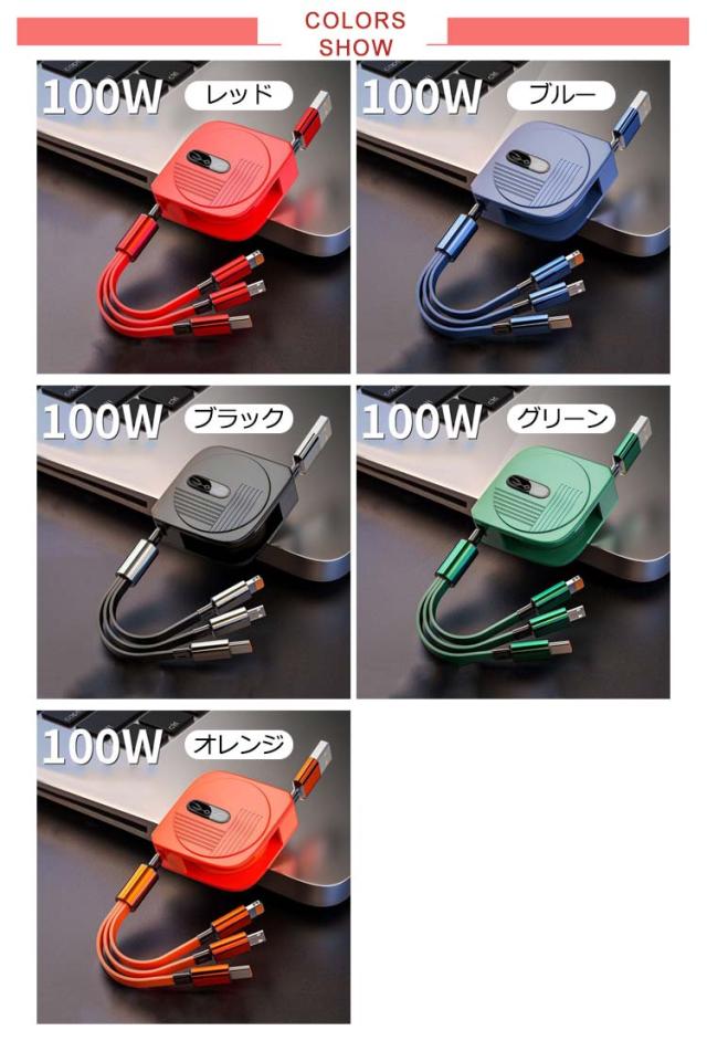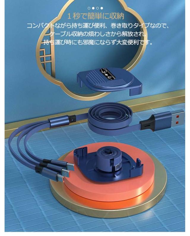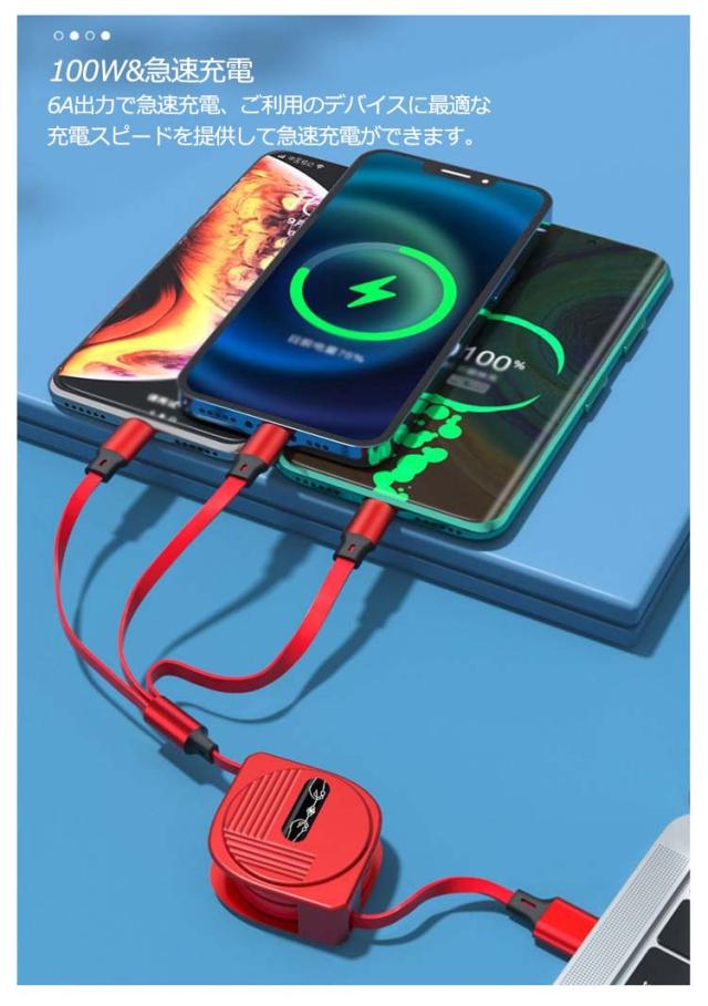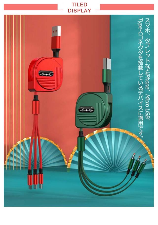 | 優れた耐久性頑丈な一本で3役実現できる巻取りケーブル。 スマホ、タブレットなどiPhone、Micro USB、Type-Cコネクタを搭載しているデバイスに適用です。 自宅、旅行、外出先でもマルチケーブル一本で十分! 6A出力で急速充電、ご利用のデバイスに最適な充電スピードを提供して急速充電ができます。 コンパクトながら持ち運び便利、巻き取りタイプなので、ケーブル収納の煩わしさから解放され、持ち運び時にも邪魔にならず大変便利です。 | |