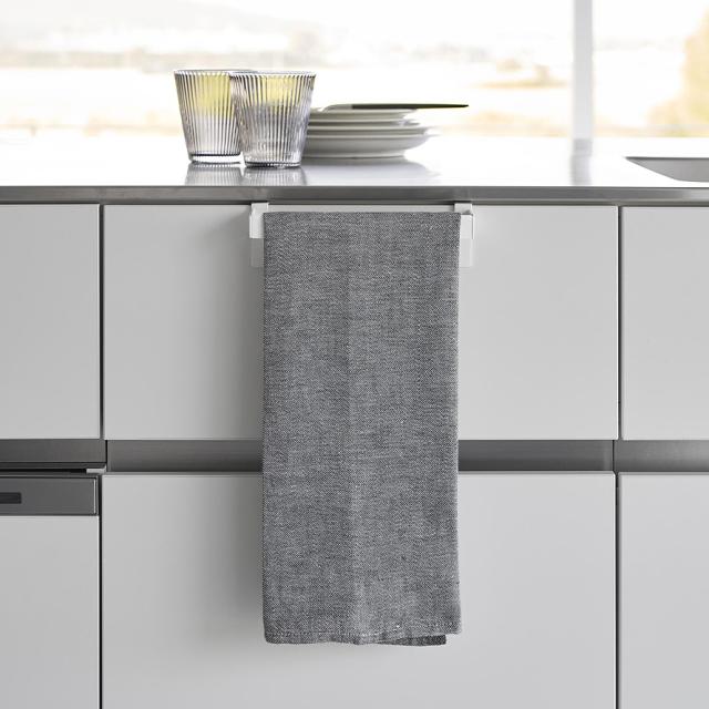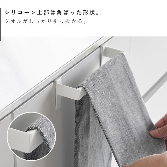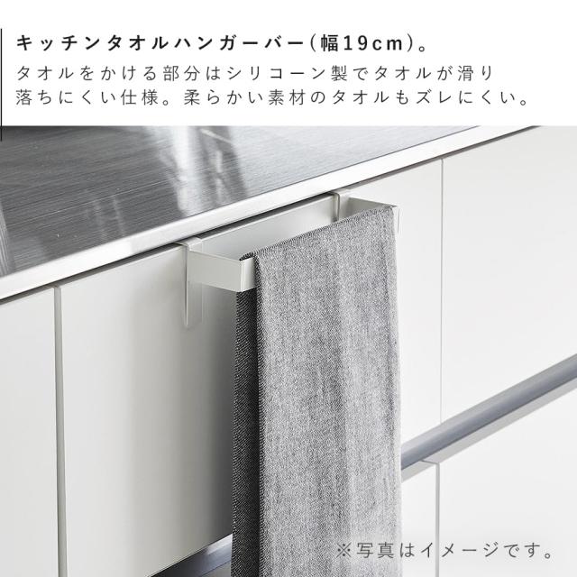 シリコーン製の滑り止めカバーが、タオルのズレや滑り落ちを防ぐキッチンタオルハンガーバー(幅19cm)です。柔らかい素材のタオルでも、手を拭いた時にズレにくく安心。