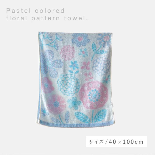 今治ブランドの高級品質、ソフトな触り心地。淡いパステルカラーの糸を3色組み合わせて花柄を表現。清涼感のあるデザインのタオルです。大人が体を拭くにも充分、バスタオルなら少し大きく感じるお子様にもちょうど良いサイズ。