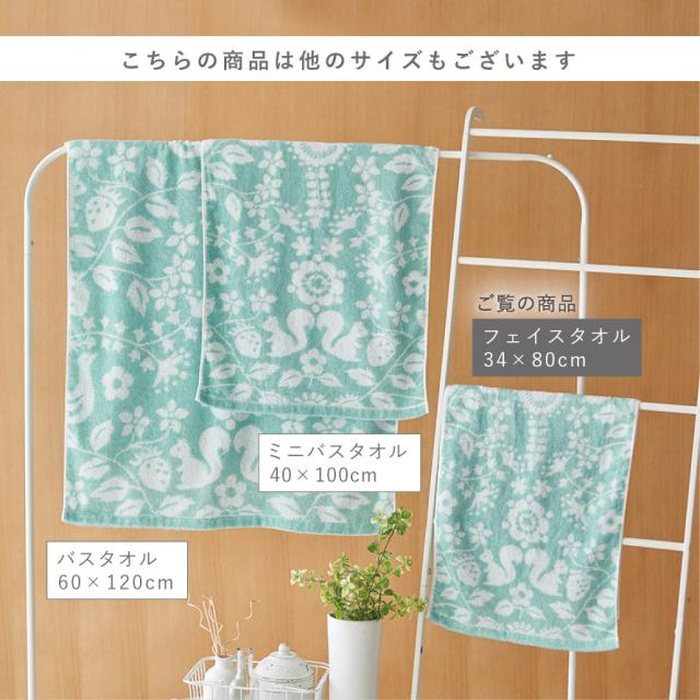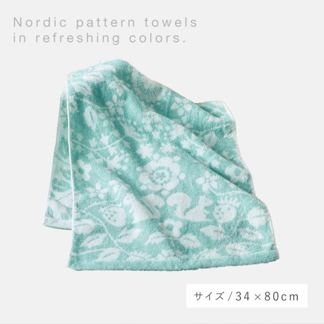 今治ブランドの高級品質、ソフトな触り心地。リスや鳥、草花や野いちごの絵柄を配置し、北欧の森をイメージしたデザイン。ブルーグリーンの爽やかなカラーのタオルです。