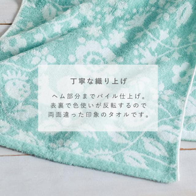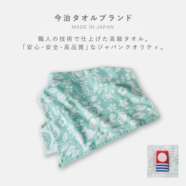 今治ブランドの高級品質、ソフトな触り心地。リスや鳥、草花や野いちごの絵柄を配置し、北欧の森をイメージしたデザイン。ブルーグリーンの爽やかなカラーのタオルです。