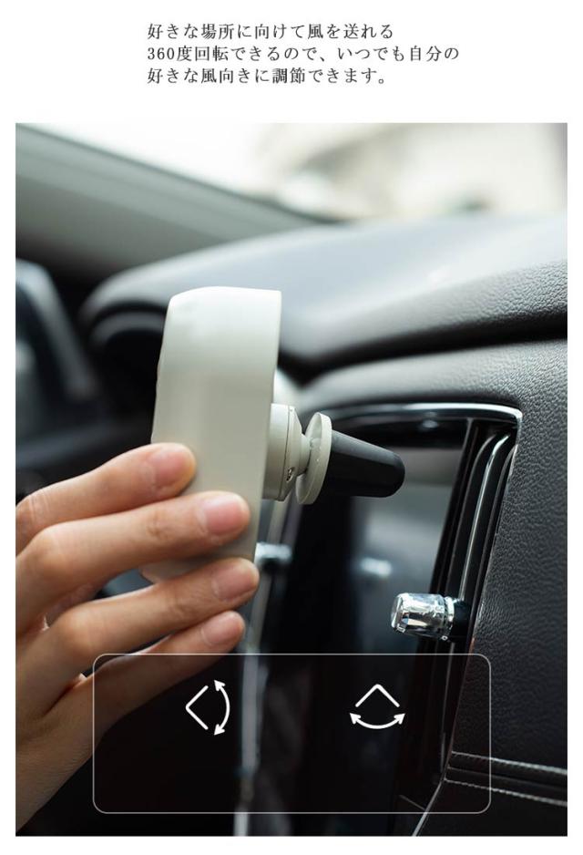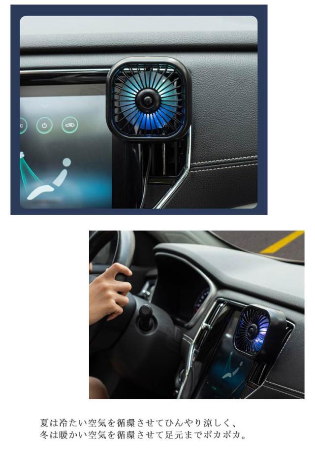 | 車のエアコンの吹き出し口に差し込むだけで冷暖房効率を上げる車載用扇風機です。 エアコン吹き出し口に簡単に設置できます。クリップ部分を隙間に入れるだけで、エアーベントにしっかりと留まります。 好きな場所に向けて風を送れる360度回転できるので、いつでも自分の好きな風向きに調節できます。 ボタン操作で3段階の風量調節が可能です。車内をさりげなく照らすLEDムードライト機能付き。 夏は冷たい空気を循環させてひんやり涼しく、冬は暖かい空気を循環させて足元までポカポカ。後部座席まで快適な空間を作り出します。 USB電源なので車内だけでなく部屋やオフィスで卓上タイプとして使うことも可能です。 | |