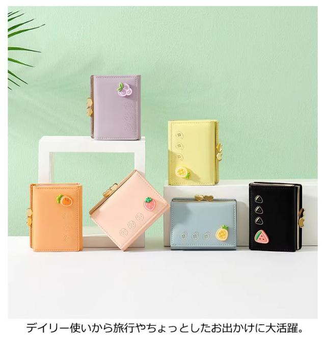 | かわいい果物柄のミニ三つ折り財布。 コンパクトなサイズながらお札入れ、小銭入れ、カード入れがそれぞれ収納できちゃいます◎ ウエストポーチやミニバッグの中に入れるのにちょうどいい大きさです♪ 大きく開くがま口がコインを取り出しやすく使い心地◎ デイリー使いから旅行やちょっとしたお出かけに大活躍。 | |