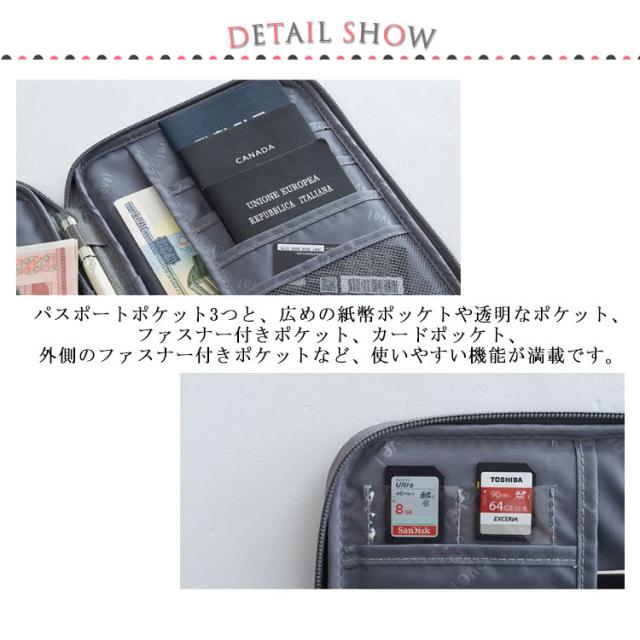 | パスポートの保護や携帯に便利な、パスポートケース。 パスポートやクレジットカードなどの貴重品のほかに、鍵や紙幣、ペン、メモなどの小さいものもすっきり収納できて便利です。 表面は撥水加工が施してあるので、多少の雨や水なら濡れても心配ありません。 パスポートポケット3つと、広めの紙幣ポッケトや透明なポケット、ファスナー付きポケット、カードポッケト、外側のファスナー付きポケットなど、使いやすい機能が満載です。 ファスナー開閉なのでガバッと大きく開き、出し入れも楽々。 大容量サイズでたっぷり入る。家族旅行にも活躍すること間違いなしです。 | |