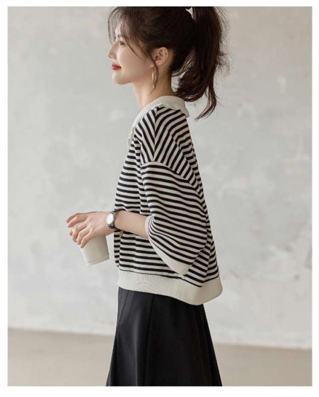 | 襟付きラウンドネックのデザインがポイントのボーダートップス。 コーデを高見えさせる大人っぽいボーダー柄に仕上げました。 ゆったりシルエットながら程よい丈感で大人っぽいスタイリングが決まるアイテムです。 春夏に活躍する半袖仕様。暖かい季節のお出かけやリラックスタイムに快適。 コットンとスパンデックス混合生地を使用し、肌触りもよく伸縮性抜群。長時間の着用でも快適に◎ リラックス感溢れるゆったりめなシルエット♪部屋着としてもおススメ! | |