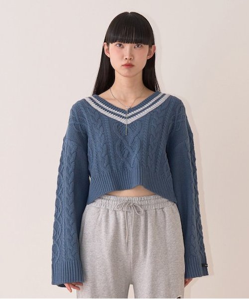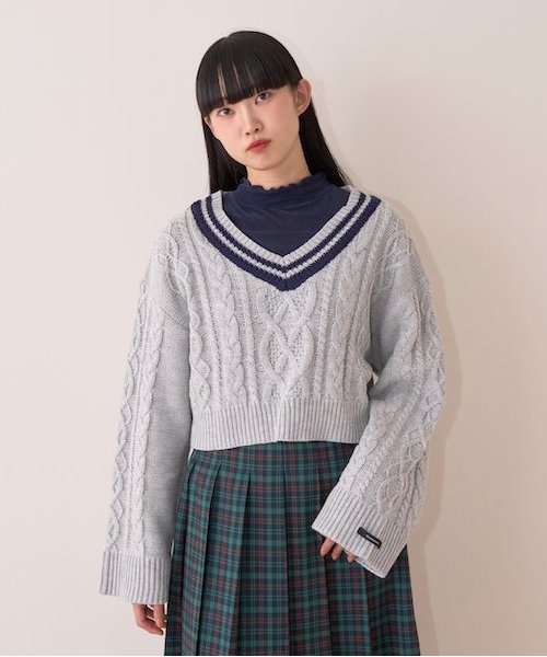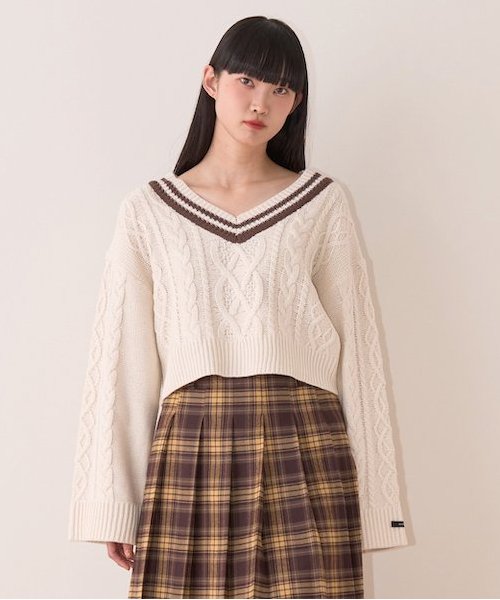 大きめのケーブル編みがポイント◎肩の落ちたルーズなシルエットとクロップド丈で華奢見えを叶えます。
