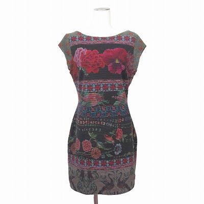 【中古】デシグアル Desigual ワンピース ミニ キャップスリーブ 花 鳥 総柄 L 黒 ブラック レディース
