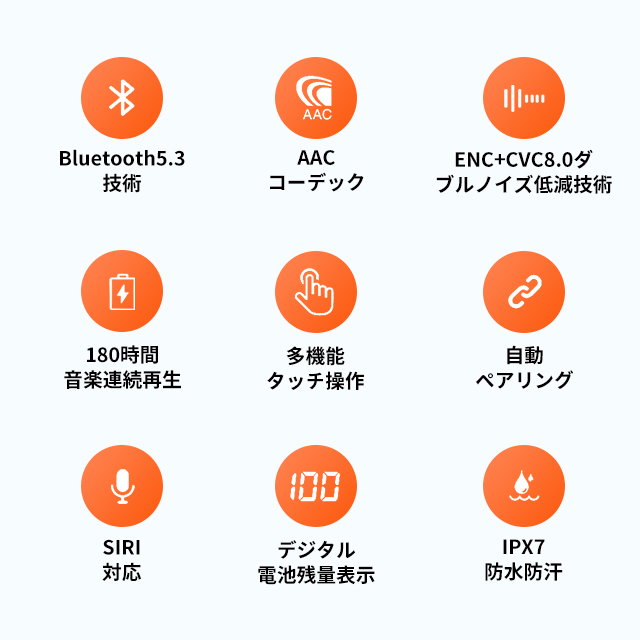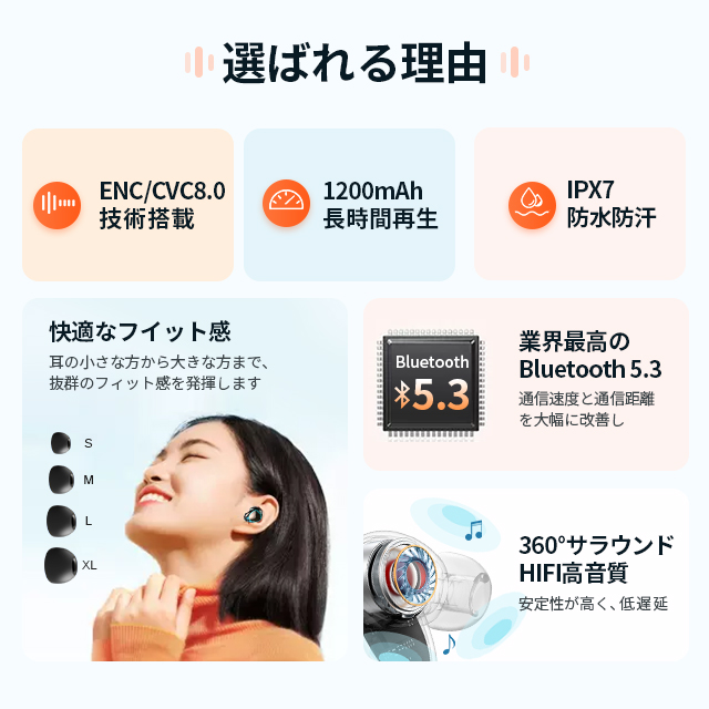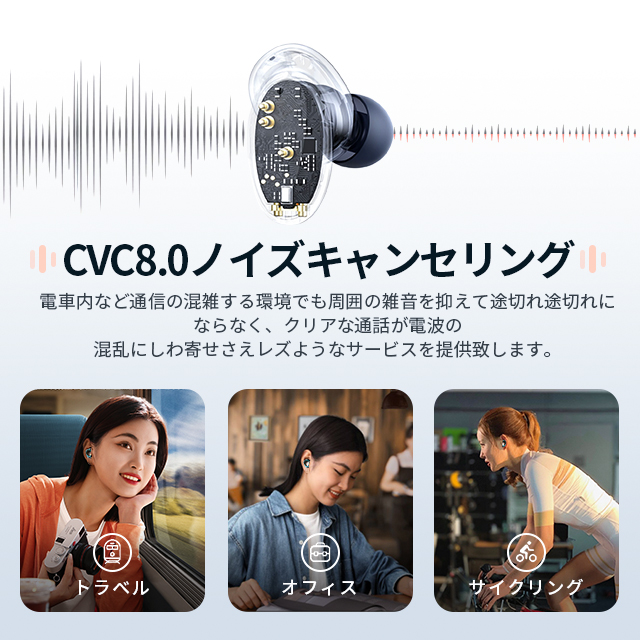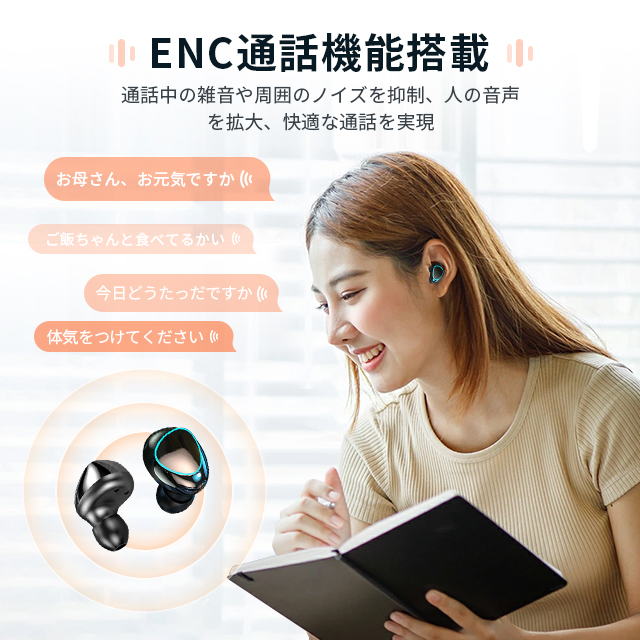 【ENC/CVC8.0ダブルノイズ低技術】完全ワイヤレスイヤホンは小型の高性能マイクとビームフォーミング技術により、周囲の雑音を拾いにくい、自分の発話だけに焦点を当てて通話相手へ明瞭に伝えられるため。