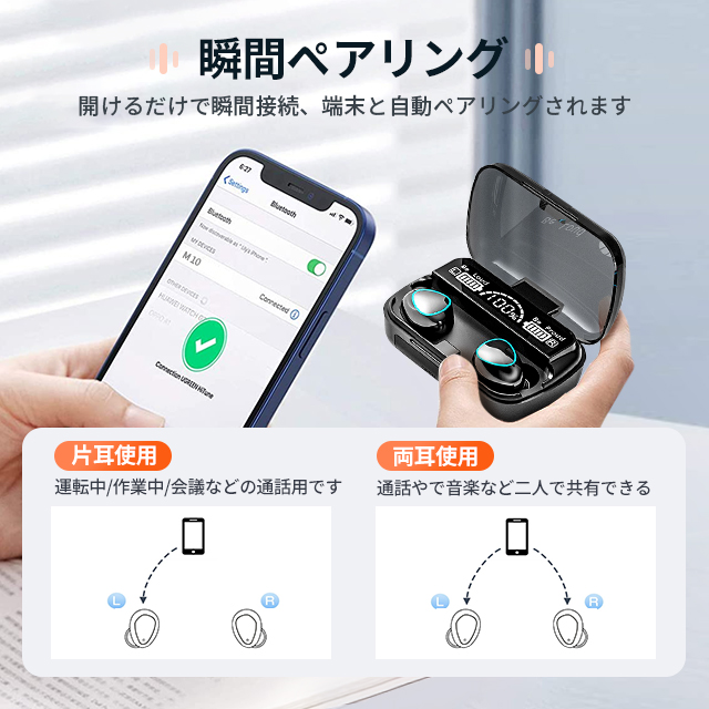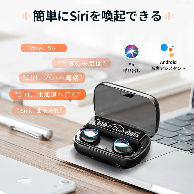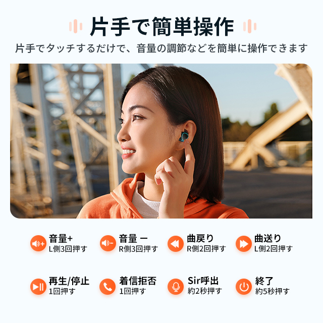 【タッチコントロール】ワイヤレスイヤホンタッチセンサーが内蔵しており、片方だけで全ての操作できます。再生/一時停止、曲送り、曲戻す、siri/音声コマンドの操作が簡単にできます。