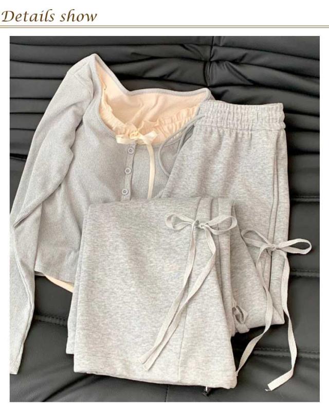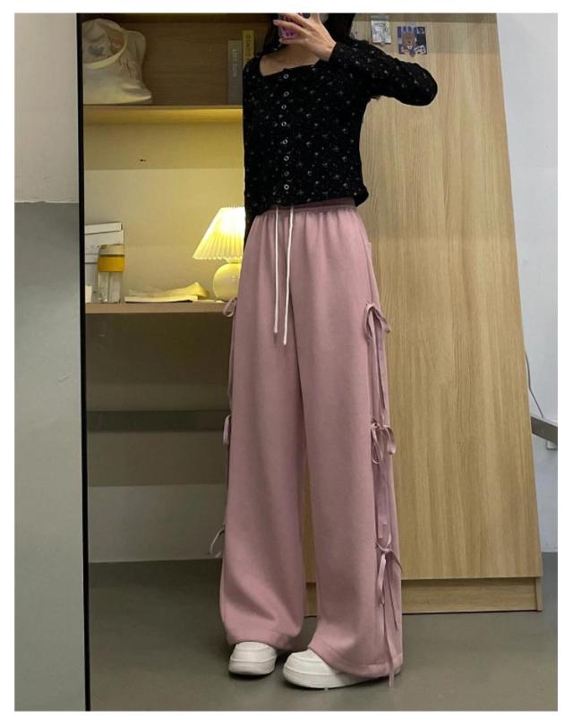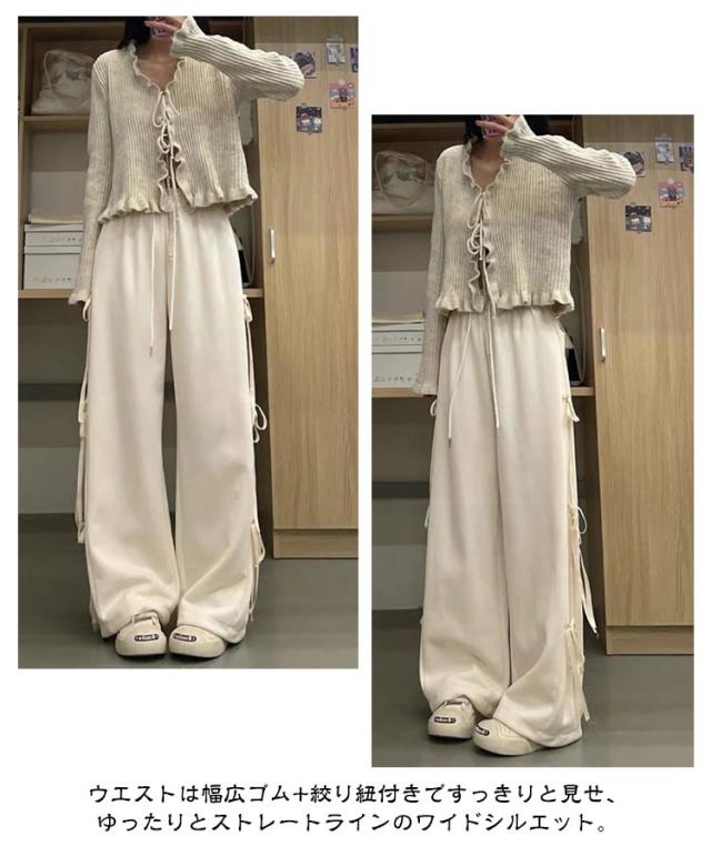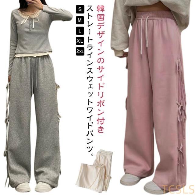 ワイドパンツ スウェットパンツ ボトムス スウェット ロングパンツ リボン 長ズボン サイドリボン ストレートパンツ ウエストゴム おしゃれ カジュアル 大きいサイズ ゆったり 韓国ファッション スウェットパンツ 薄手 春 夏 秋