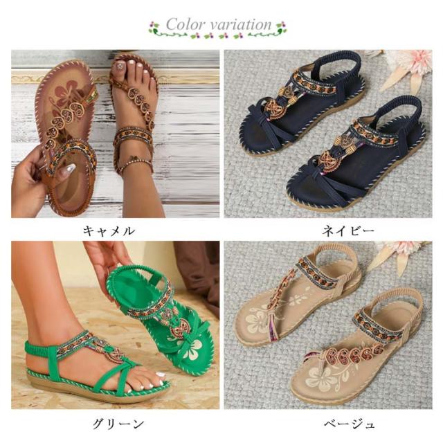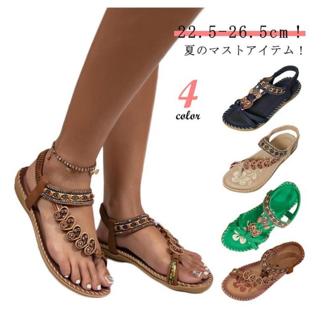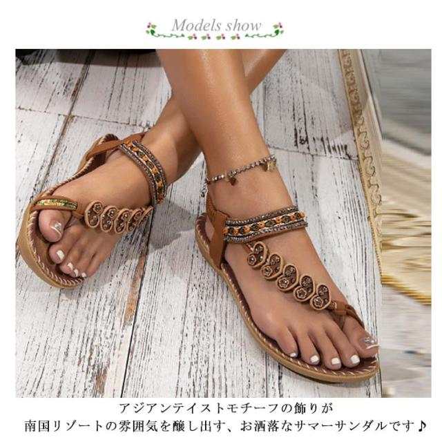 美脚 夏用 サンダル ぺたんこ レディース 編み込み サンダル ビーチサンダル フラットシューズ サンダル ビジュー エスニック 歩きやすい ジュニア ローヒール カジュアルサンダル 疲れない 滑り止め ボヘミアン アジアン 水遊び お出かけ