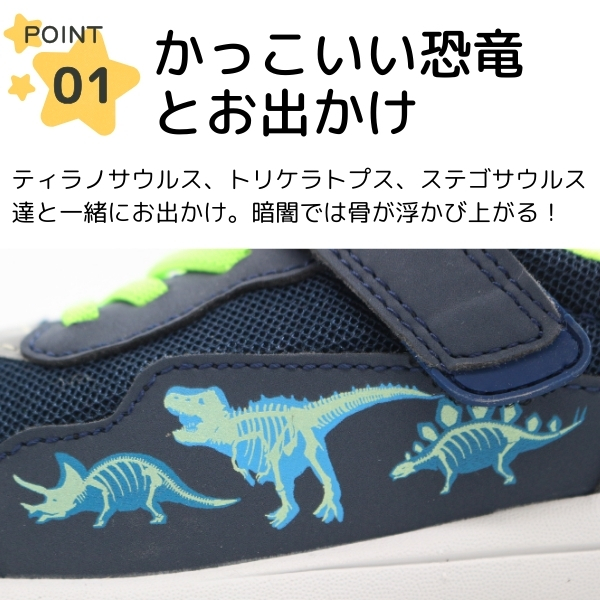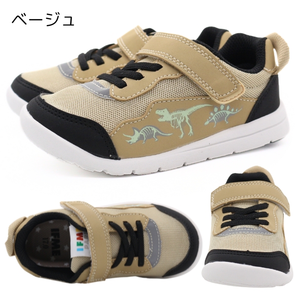 イフミー スニーカー キッズ 子供 ジュニア ベージュ 紺 ネイビー 恐竜 光る ティラノサウルス 幅広 3E 軽量 軽い ベルト マジックテープ 反射材 男の子 女の子 光る恐竜ほねほねスニーカー イフミーいきもの IFME IKIMONO 20-5810