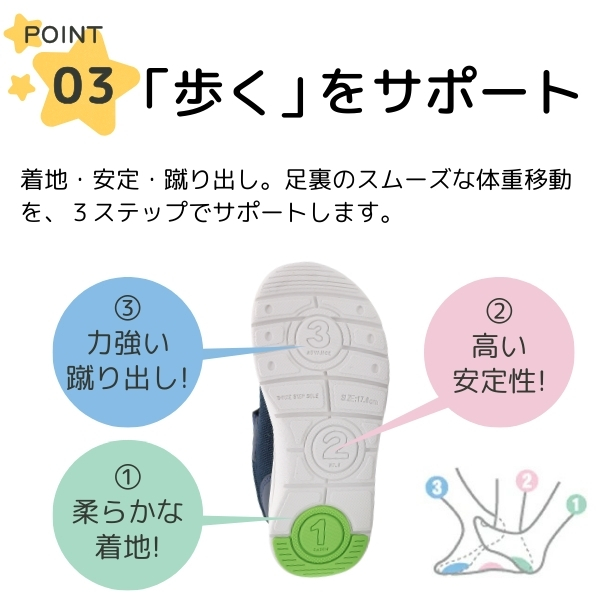 着地・安定・蹴り出し。足裏のスムーズな体重移動を、3ステップでサポートします。