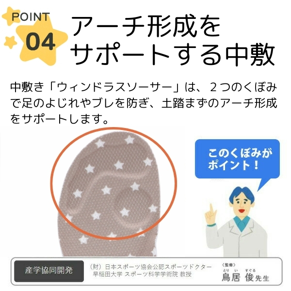 中敷き「ウィンドラスソーサー」は、2つのくぼみで足のよじれやブレを防ぎ、土踏まずのアーチ形成をサポートします。