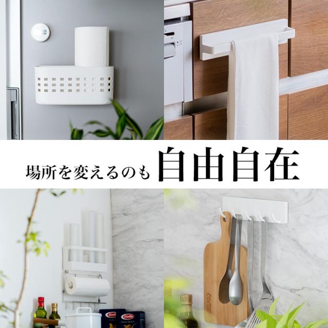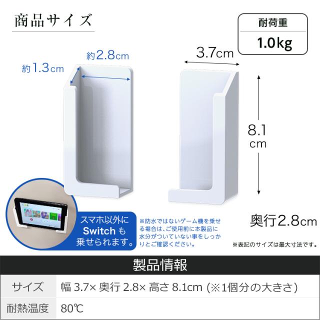 磁石の力でキッチン廻りに簡単取付!取り外し、位置替えも簡単で壁を傷つけません。スマホはもちろんタブレットにも対応したアイテムです。タテ向きにも取付OK。※商品の取付方向にご注意ください。※防水仕様ではありませんので、スマホ・タブレットの取り扱いには注意してください。耐荷重 : 1.0kgサイズ : 幅3.7×奥行2.8×高さ8.1cm材質 : 本体=ABS樹脂/ラバーマグネット スベリ止め=ポリウレタン