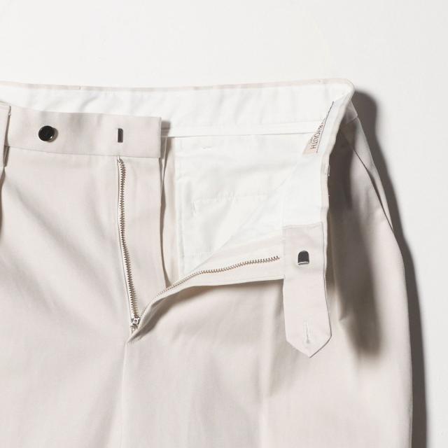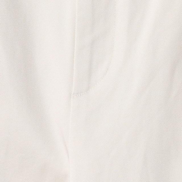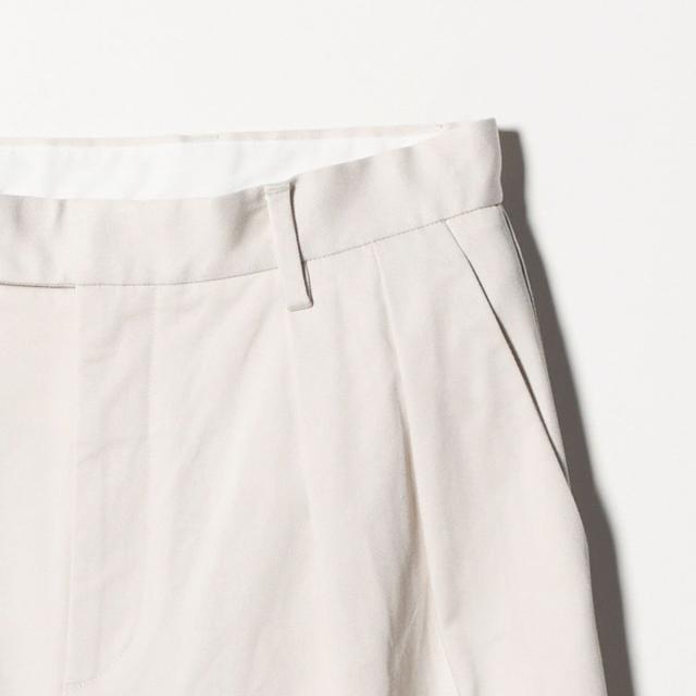 2タック仕様でヒップからわたり、膝にかけてたっぷりとゆとりを持たせたリラクシーなワイドシルエットは、素材のハリ感によって裾まで美しいラインをキープ。