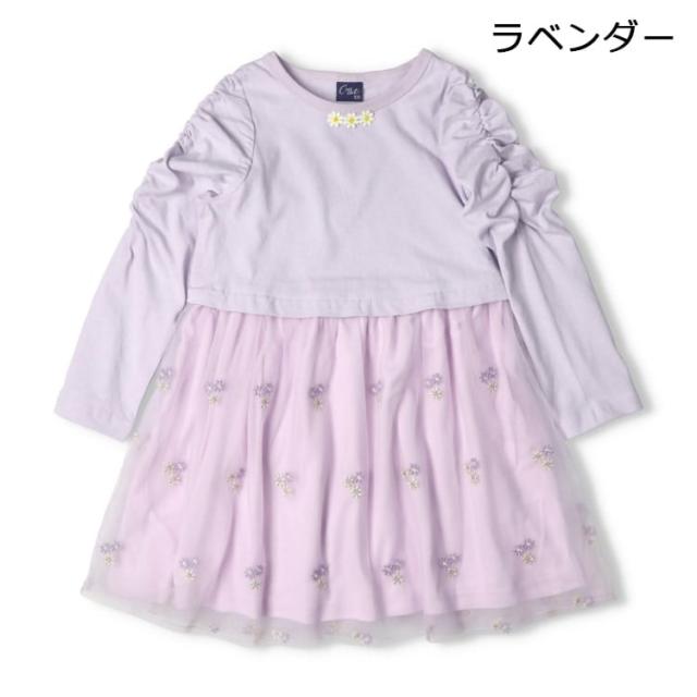お花の刺繍のチュールのスカートのドッキングデザインがプリンセスみたいな長袖ワンピース。袖のギャザーが大人っぽいデザイン。首元のお花のレースのモチーフもポイント!(ベビーサイズのみ肩ボタン仕様になります。)【アイテム】トップス シンプル ガーリー フェミニン カジュアル お洒落 オシャレ かわいい 可愛い 普段着 デイリーウェア お出かけ着 お外着 お外遊び着 子ども こども 女児 女の子 ガールズ キッズ ベビーサイズ トドラーサイズ 幼稚園 保育園 小学校 通園 通学 小学生 2025年秋冬物新作 丸高衣料 ロングスリーブ 長袖 ラベンダー 薄紫色 ピンク クレセント フラワー プリンセス お姫様
