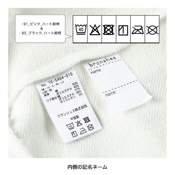■素材:03_オフホワイト/04_アイボリー/20_サックス/31_ピンク/46_ラベンダー/67_ライトグリーン/85_ブラック/86_ミックス/91_ピンク_ハート総柄/92_ブラック_ハート総柄:【86:ミックス&91:ピンク_ハート総柄&92:ブラック_ハート総柄】本体:綿60% ポリエステル40% リブ部分:綿95% ポリウレタン5% 【それ以外】本体:綿60% ポリエステル40% リブ部分:綿57% ポリエステル38% ポリウレタン5%