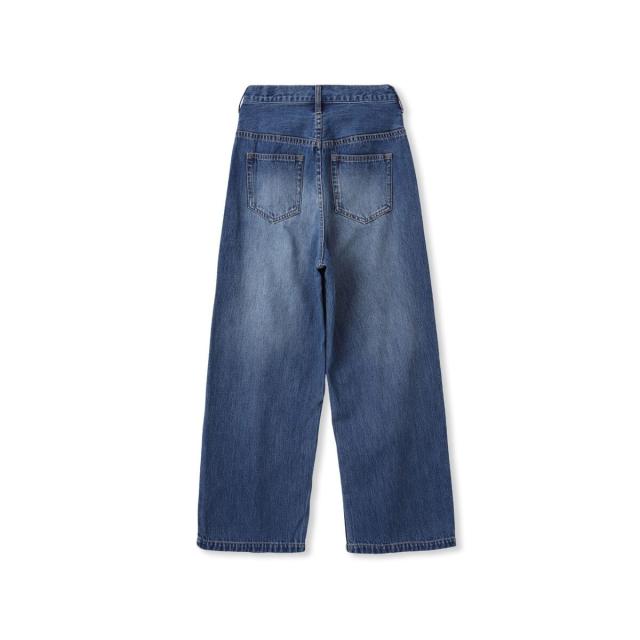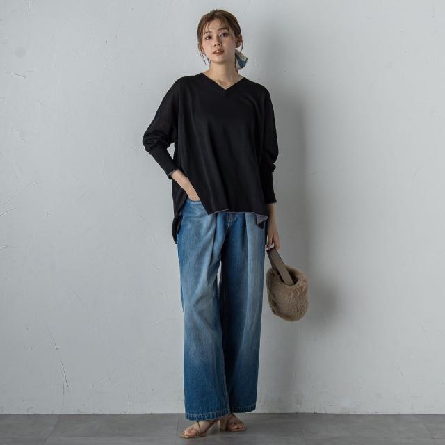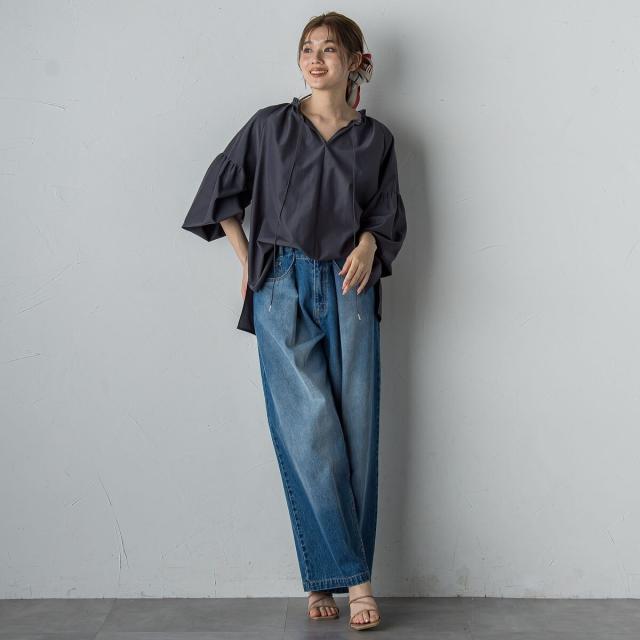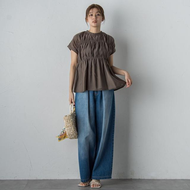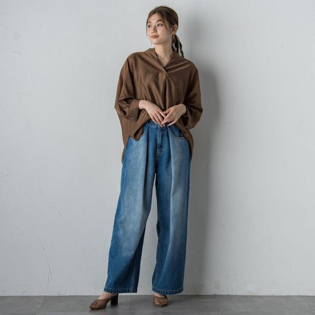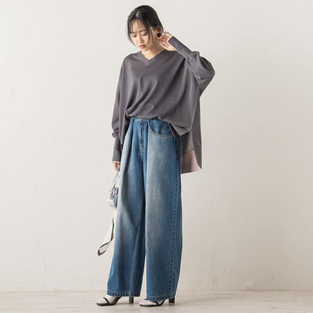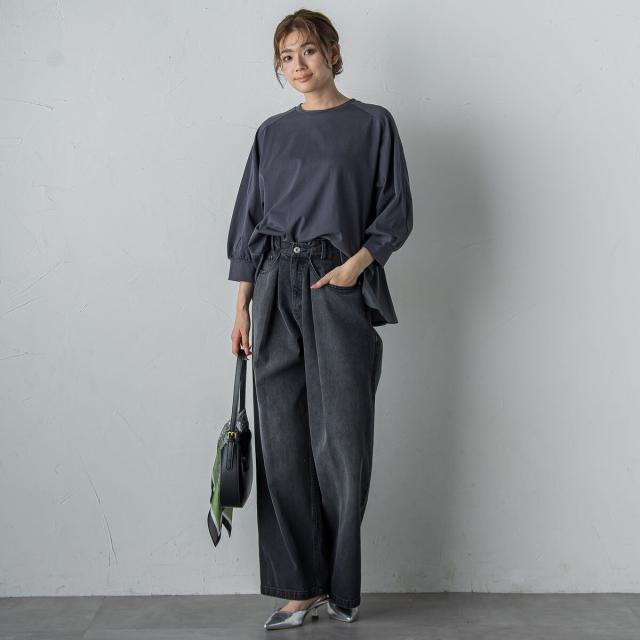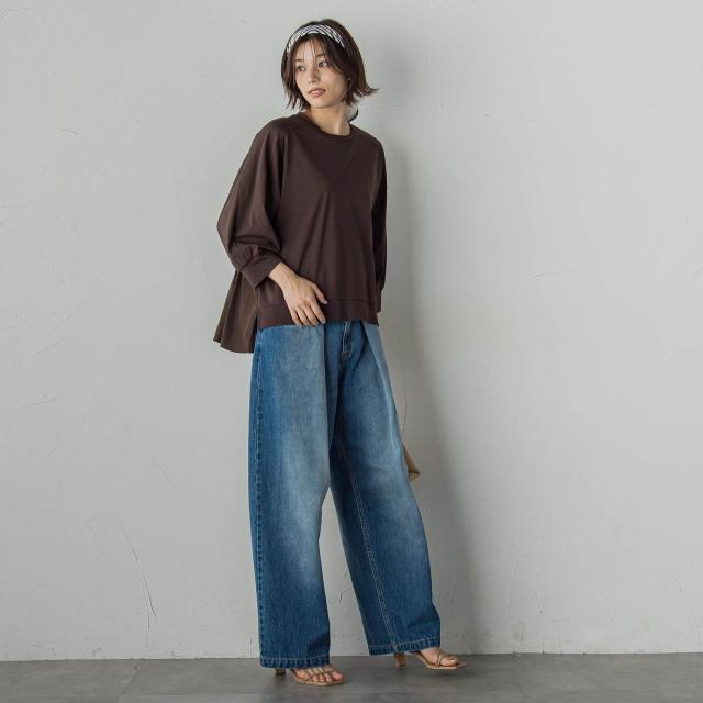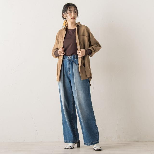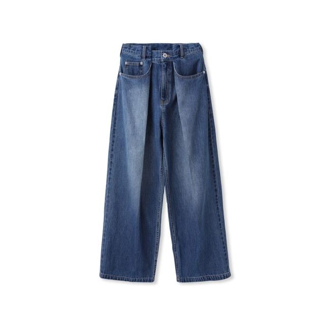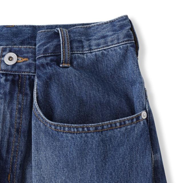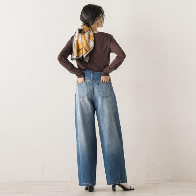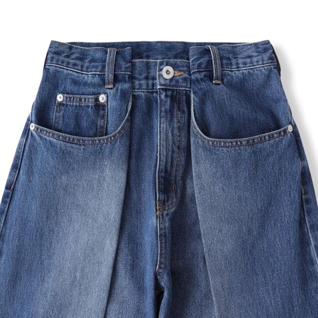 程良く落ち感の出るミドルオンスのデニムで柔らかく、タックの分量でヒップ回りのゆとりもあり、楽な穿き心地のデニムです。