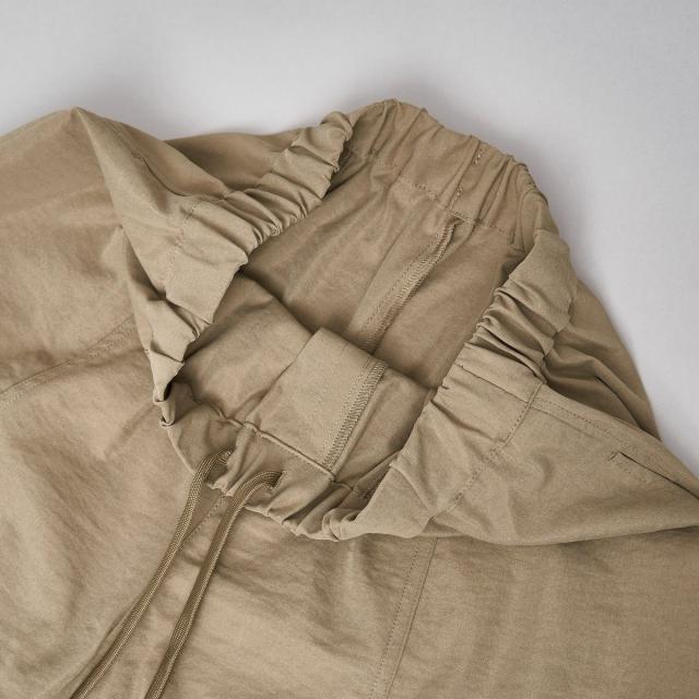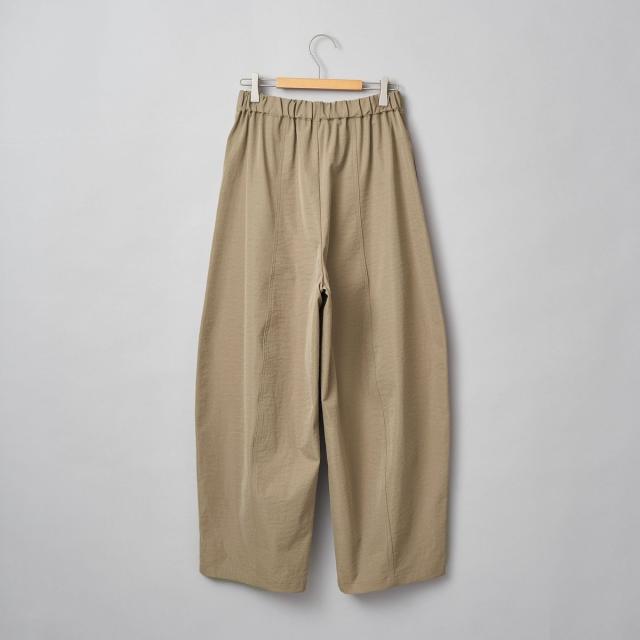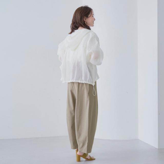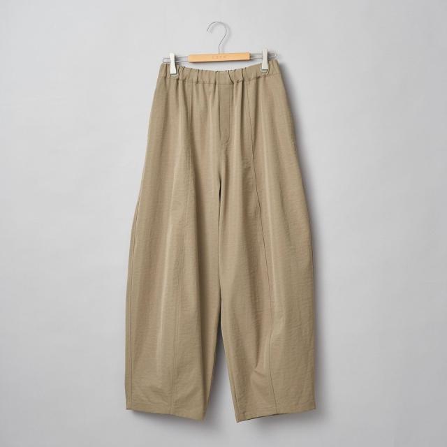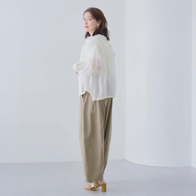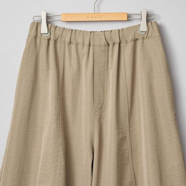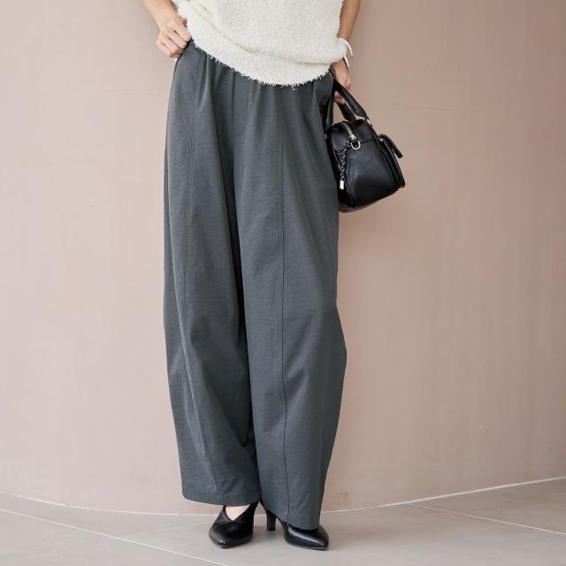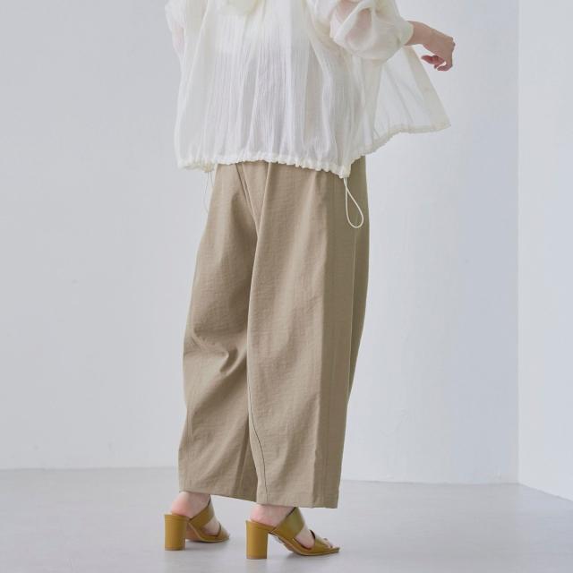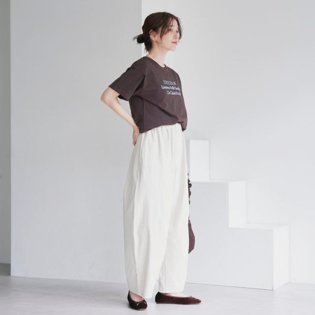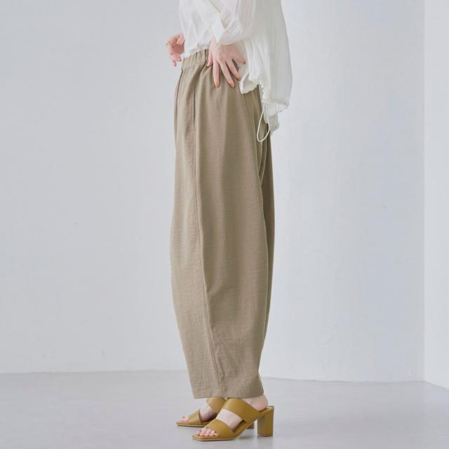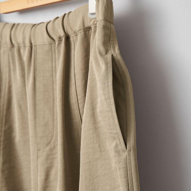 ウエストはゴム仕様でラクな穿き心地ながら、上品な表情できれいめコーデにも◎