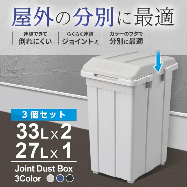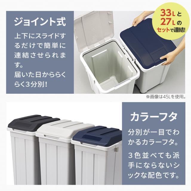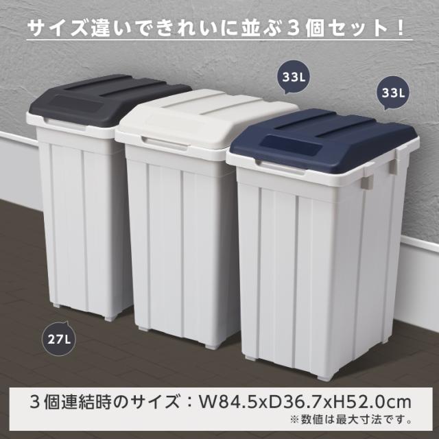容量 : 93リットル ( 33リットル ×2個 27リットル ×1個 )サイズ : 幅84.5×奥行36.7×高さ52.0cm(連結時)材質 : 本体・フタ・ポリ袋止め=ポリプロピレン日本製