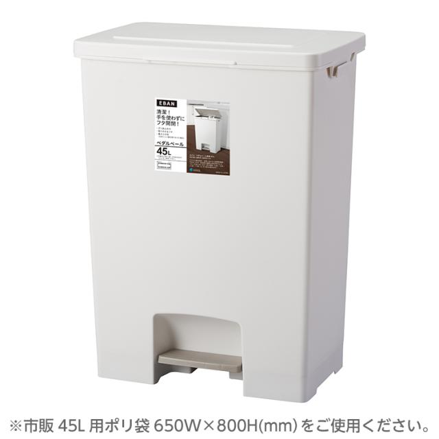 手を使わずに簡単開閉できるペダル式ゴミ箱。場所をとらない薄型ワイド設計。容量 : 45リットル サイズ : 幅43.1×奥行28.4×高さ58.4cm材質 : 本体・フタ・ポリ袋止め・ペダル=ポリプロピレン ロッド=スチール(クロームメッキ)日本製