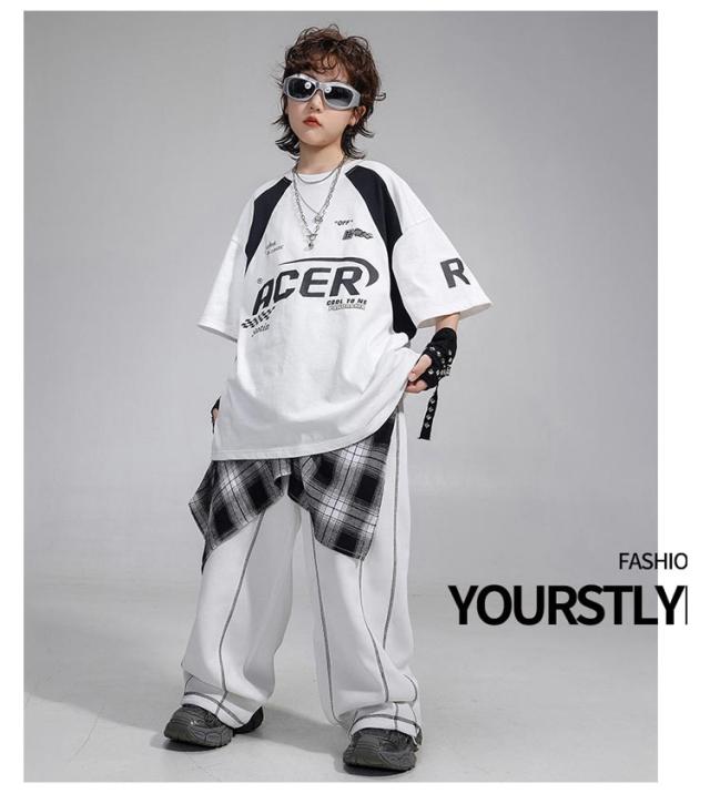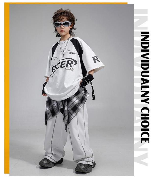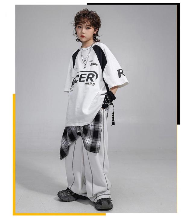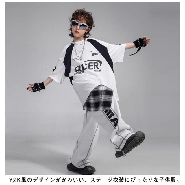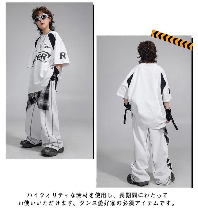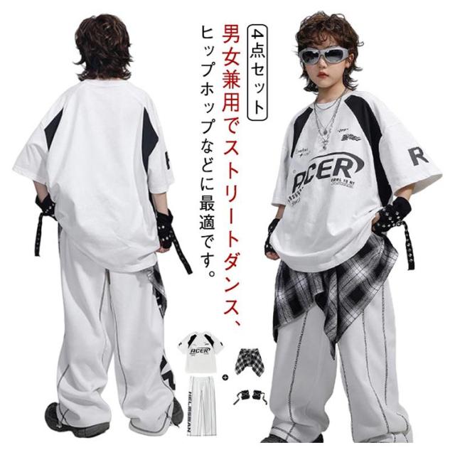 4点セット ヒップホップ 衣装 キッズ ダンス衣装 セットアップ Tシャツ ロングパンツ ワイドパンツ 韓国風 おしゃれ 子供ダンス服 白 K-POP hiphop 男の子 ガールズ ステージ衣装 ジャズダンス jazz 発表会 応援団 ラムショー 公演服 練習着 原宿系