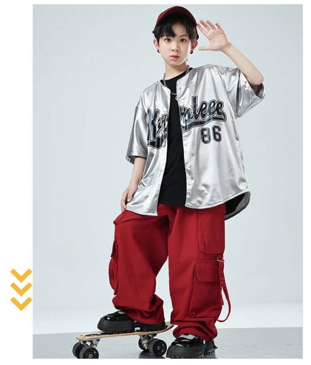 ベースボールシャツ キッズ ダンス 衣装 セットアップ シャツ シルバー 赤 子供服 ヒップホップ 衣装 女の子 男の子 キッズダンス衣装 シャツ カジュアル 子ども服 k-pop キッズ 練習着 ダンス衣装 応援団 団体服 イベント カーゴパンツ かっこいい