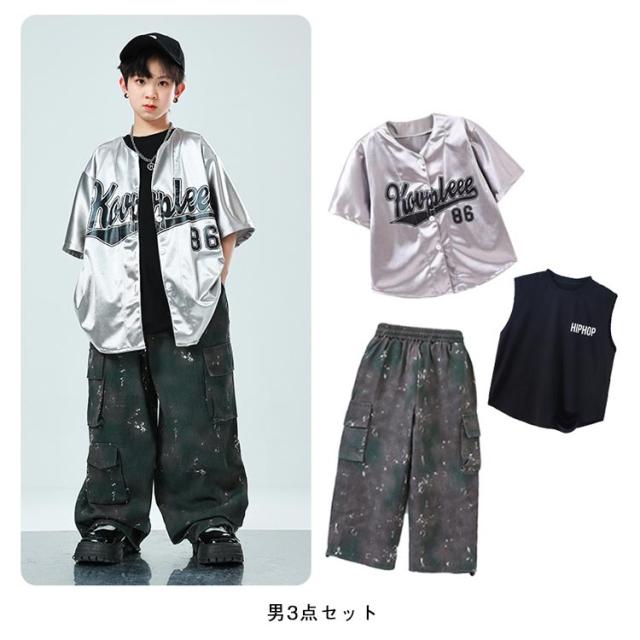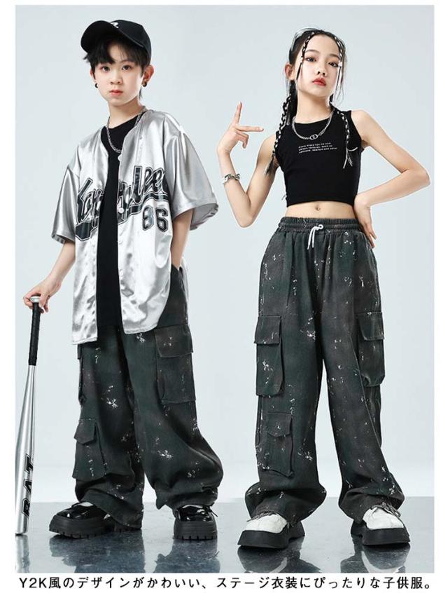 シルバー 黒 子供 ベースボールシャツ ダンス 衣装 セットアップ キッズ ヒップホップ 男の子 ベースボールシャツ 女の子 野球服 半袖 多ポケット カーゴパンツ キッズダンス衣装 JAZZストリート ダンスウェア 韓国 原宿系 演出服 k-pop おしゃれ