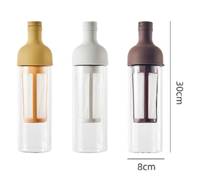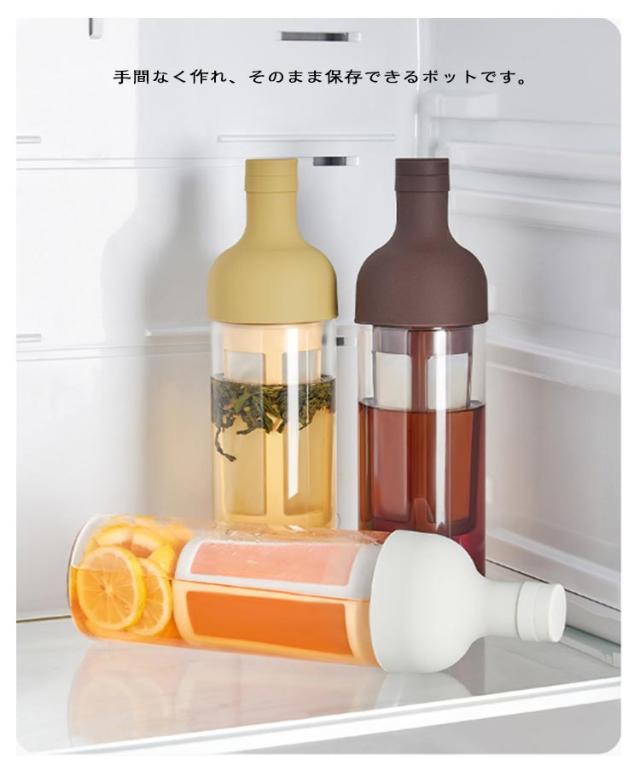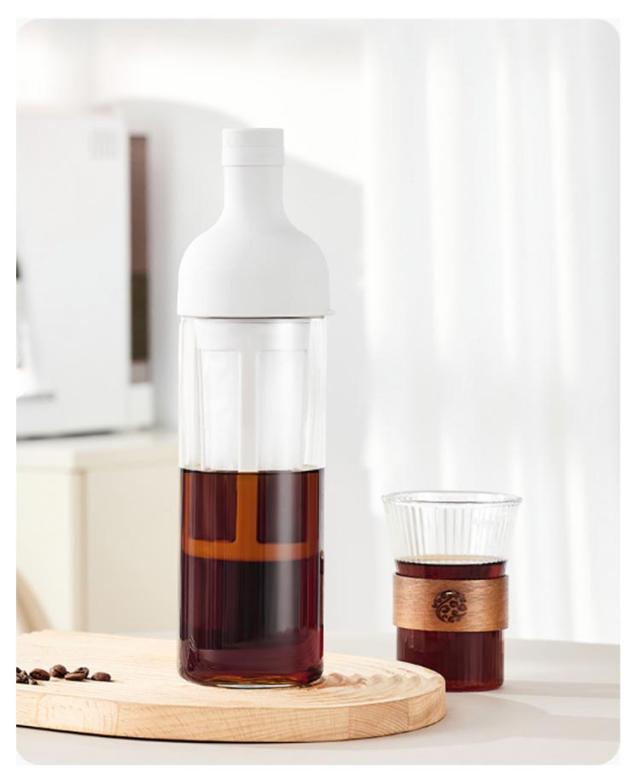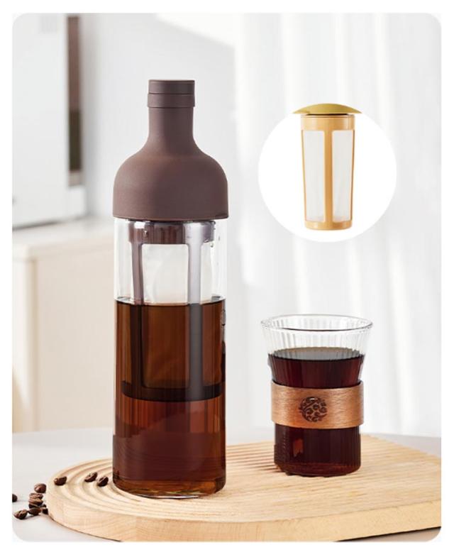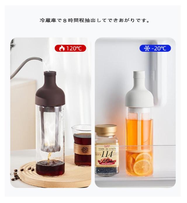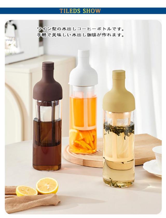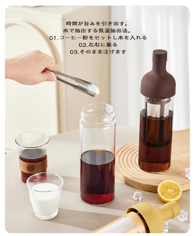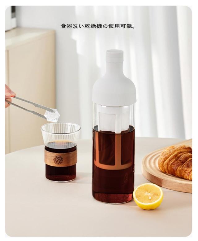 | 耐冷・耐熱ガラス 大容量1L 手軽に美味しい水出し珈琲が作れるおしゃれなワイン型ボトルです 時間が旨みを引き出す。 水で抽出する低温抽出法。 01.コーヒー粉をセットし水を入れる 02.左右に振る 03.そのまま注げます ワイン型の水出しコーヒーボトルです。 手軽で美味しい水出し珈琲が作れます。 手間なく作れ、そのまま保存できるポットです。 水でじっくり珈琲を抽出するので、珈琲豆本来の味と香りが楽しめます。 細かなメッシュの長いストレーナー付き。 食器洗い乾燥機の使用可能。 ワインボトル型の水出しコーヒーボトル コーヒー粉と水だけでアイスコーヒーが作れます。 ストレーナーにコーヒー粉を入れ、フタをして注ぎ口にセットしたら少量ずつ水を注ぎます。 水を注ぎ終えたら栓をして、ボトルをゆっくり左右に振って抽出を促します。 冷蔵庫で8時間程抽出してできあがりです。 | |