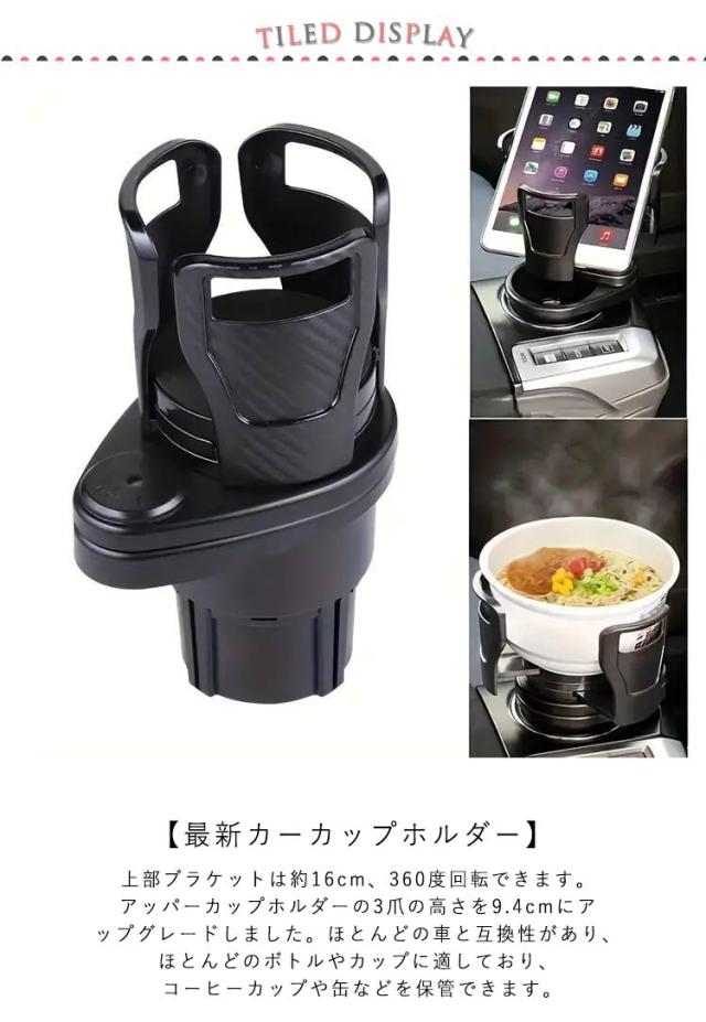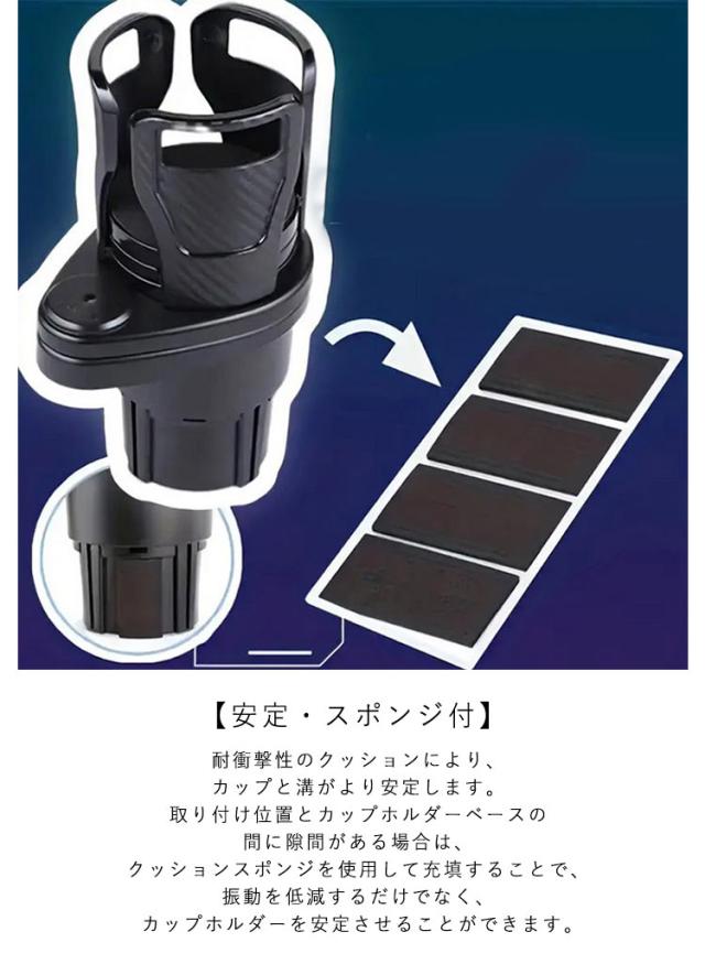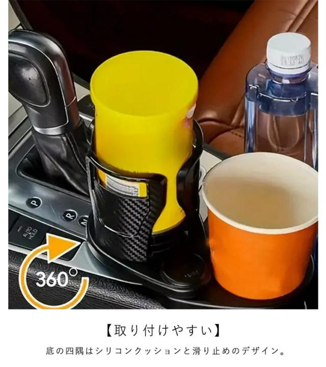 ドリンクホルダー 車用 360度回転 多機能カップホルダー マルチカップホルダー 車用カップホルダー ダブルカップ 調整 調節 可能 スマホホルダー タブレット 取付簡単 紙パック カップ麺 2in1 車載 車専用ホルダー