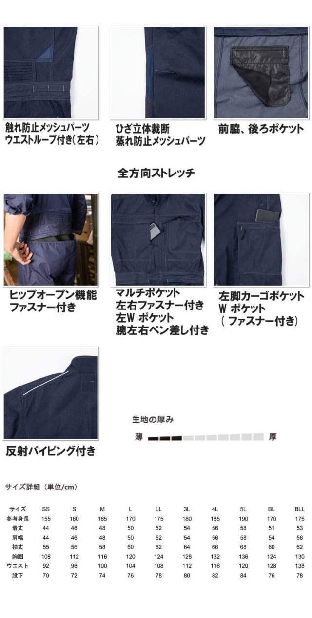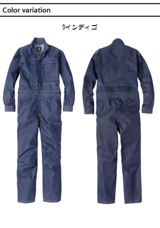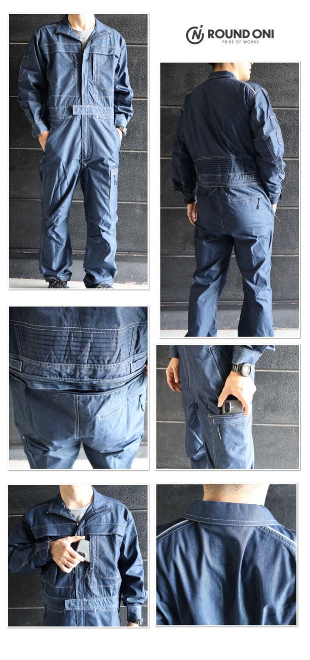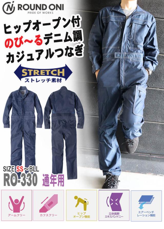 デニム調ストレッチツナギ(ヒップオープン) 長袖 つなぎ RO-330 サイズSS-3L ROUND ONI 通年 丸鬼商店 2025年春夏新作