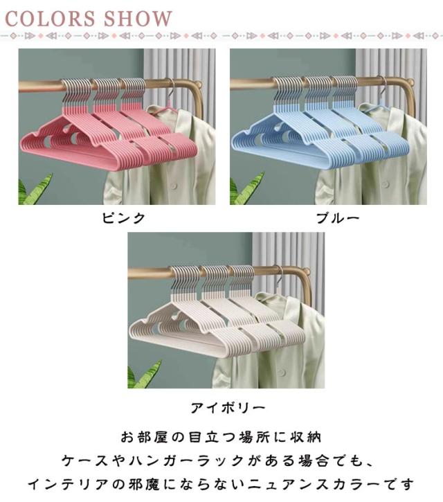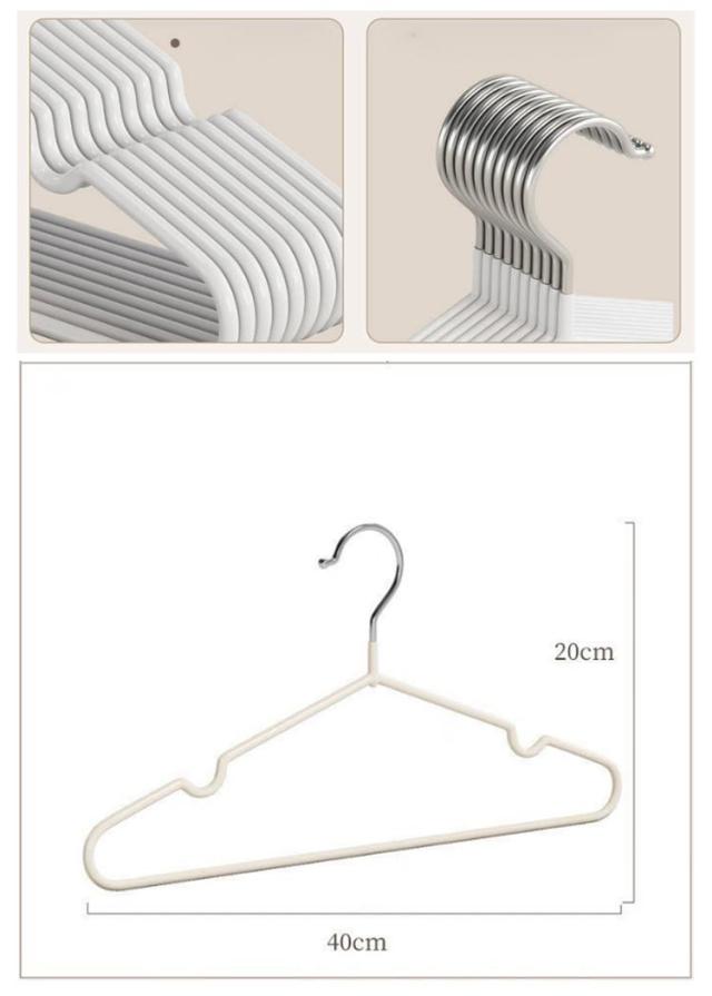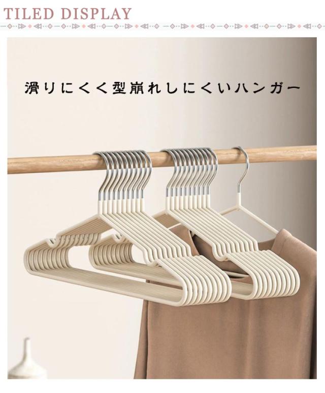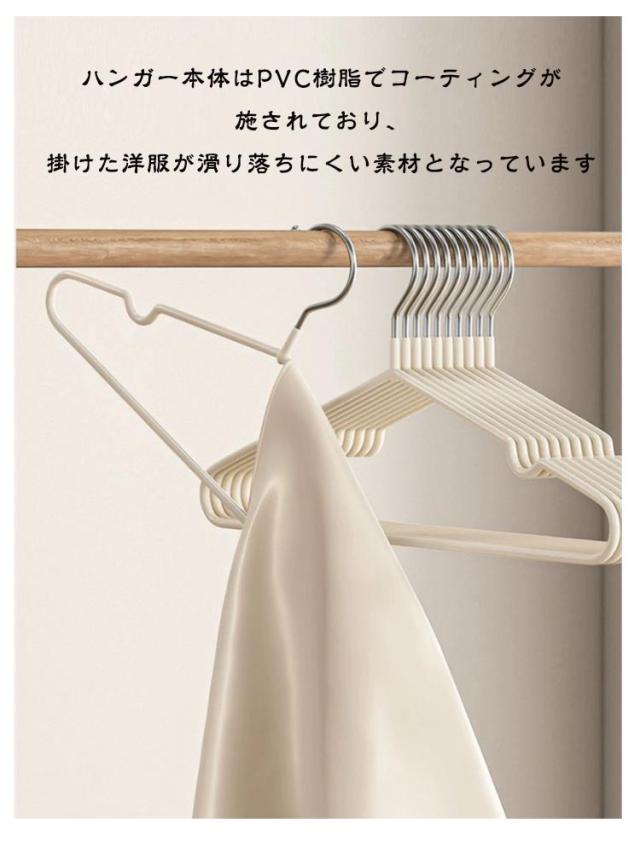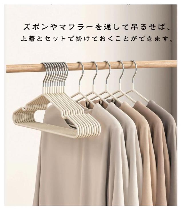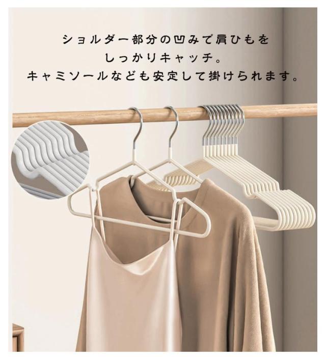 | 滑りにくく型崩れしにくいハンガー ハンガー本体はPVC樹脂でコーティングが施されており、掛けた洋服が滑り落ちにくい素材となっています ショルダー部分の凹みで肩ひもをしっかりキャッチ。キャミソールなども安定して掛けられます。 ズボンやマフラーを通して吊るせば、上着とセットで掛けておくことができます。 フレームは耐久性に優れたスチール製。適度な柔軟性があり、曲げても折れにくく丈夫です。 お部屋の目立つ場所に収納ケースやハンガーラックがある場合でも、インテリアの邪魔にならないニュアンスカラーです | |